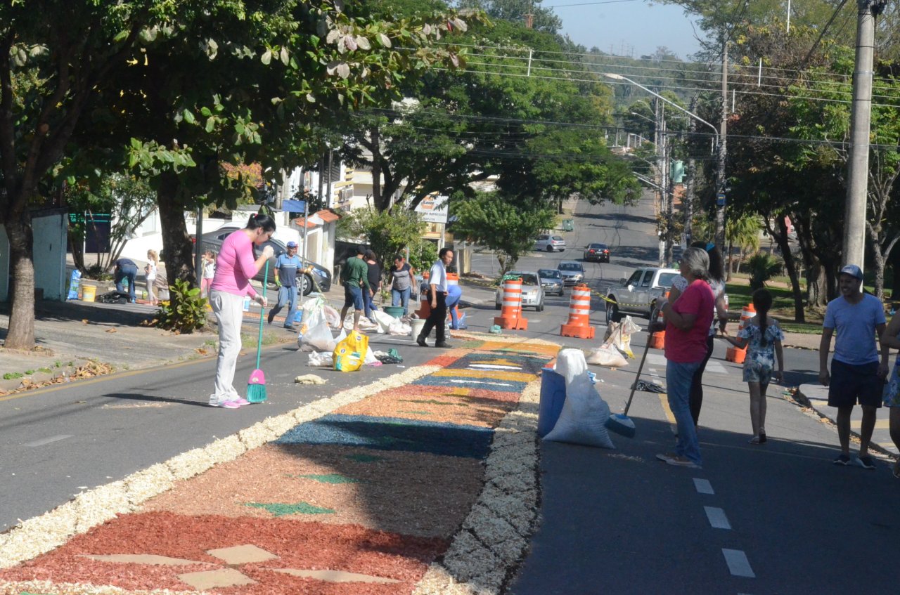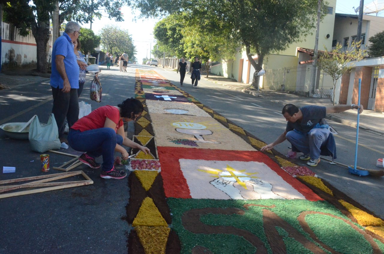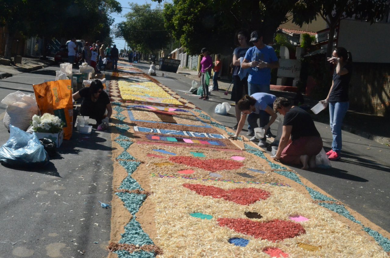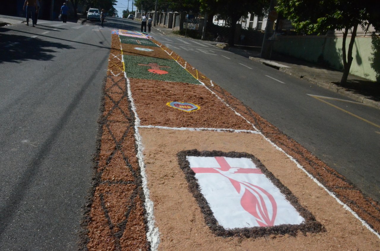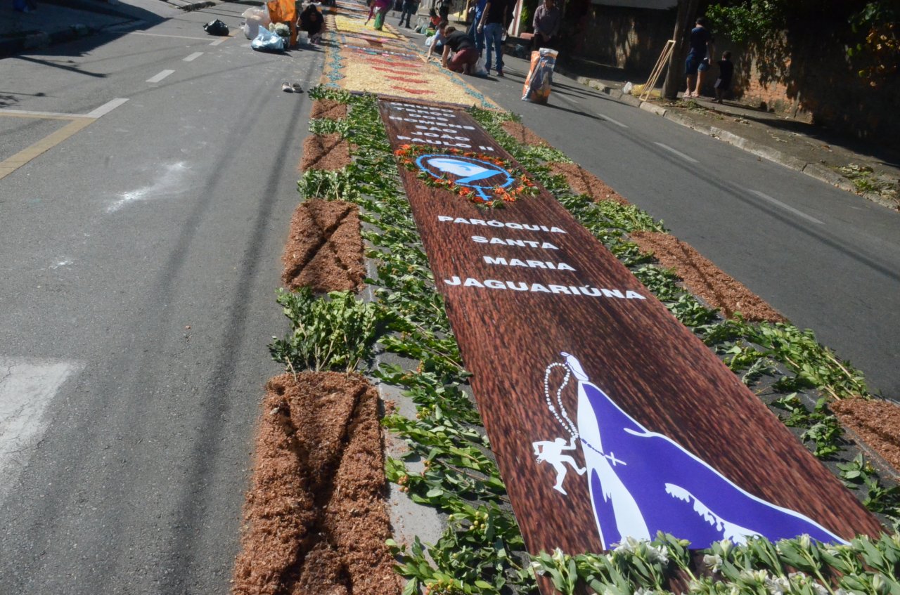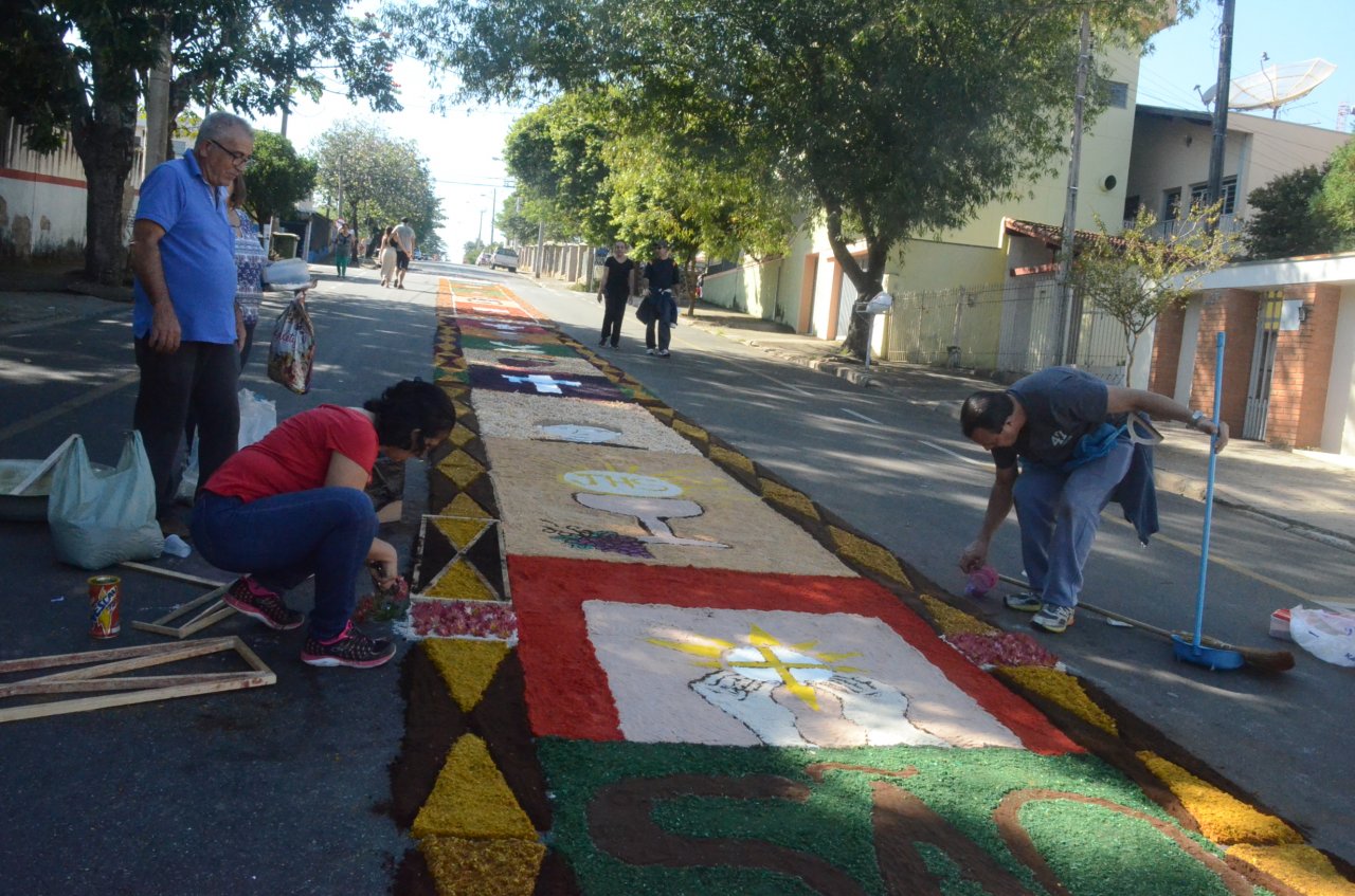 A união entre pessoas de diferentes faixas etárias, de crianças até idosos, marcou a comemoração de Corpus Christi, em Jaguariúna.Na quinta-feira, dia 20, centenas de católicos das três paróquias: Santa Maria, Beata Irmã Dulce e Sagrado Coração de Jesus levantaram cedo e se uniram na confecção do tapete, usando muita criatividade e diferentes materiais, como, serragem colorida, cascas de ovos, plantas, flores e pó de café.