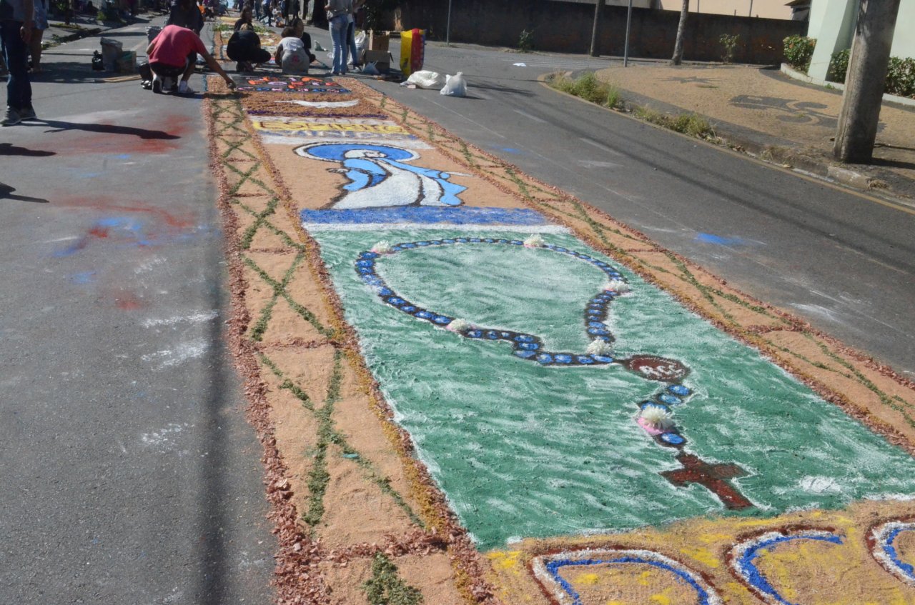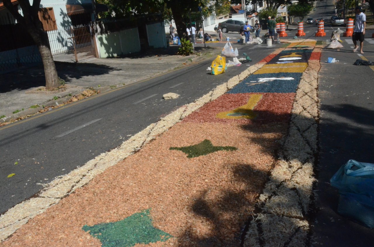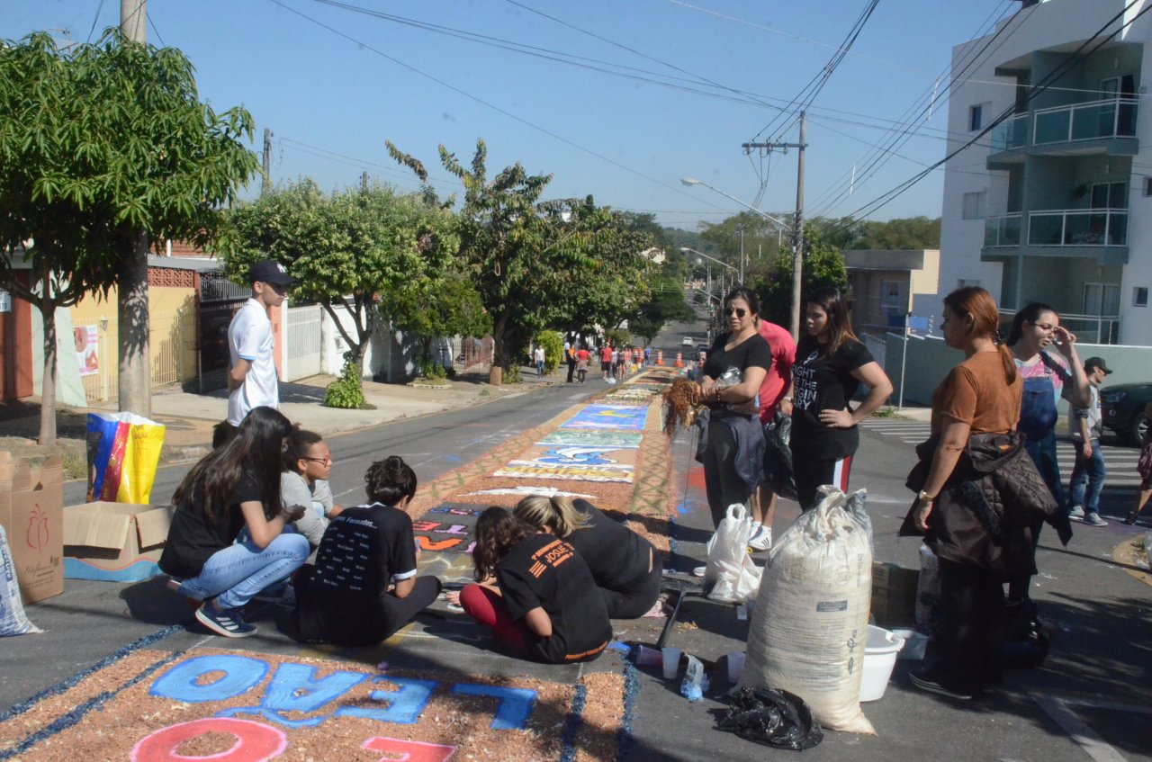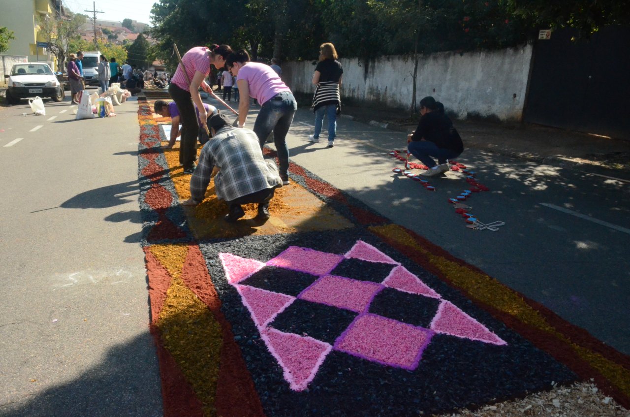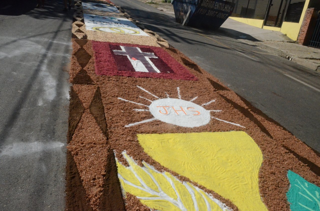 A união entre pessoas de diferentes faixas etárias, de crianças até idosos, marcou a comemoração de Corpus Christi, em Jaguariúna.Na quinta-feira, dia 20, centenas de católicos das três paróquias: Santa Maria, Beata Irmã Dulce e Sagrado Coração de Jesus levantaram cedo e se uniram na confecção do tapete, usando muita criatividade e diferentes materiais, como, serragem colorida, cascas de ovos, plantas, flores e pó de café.