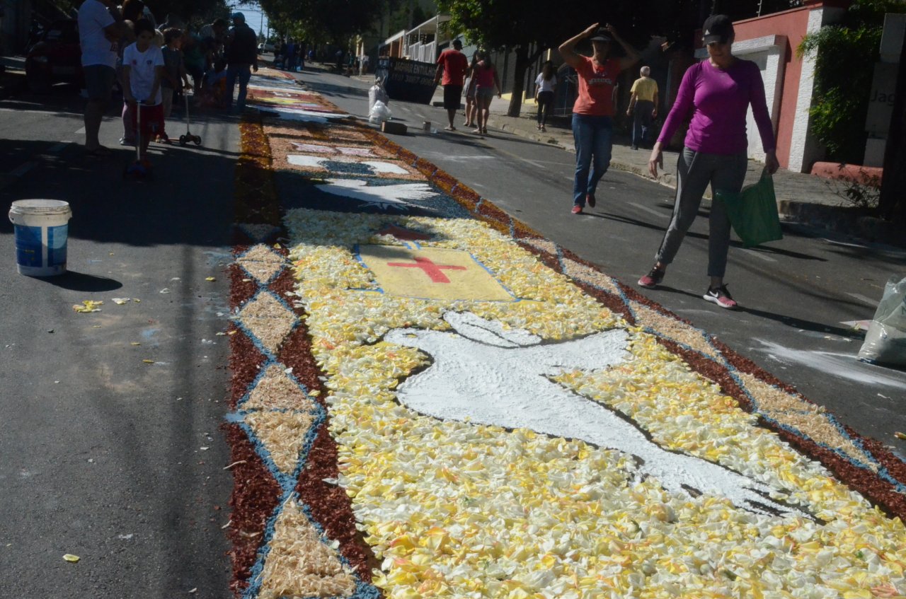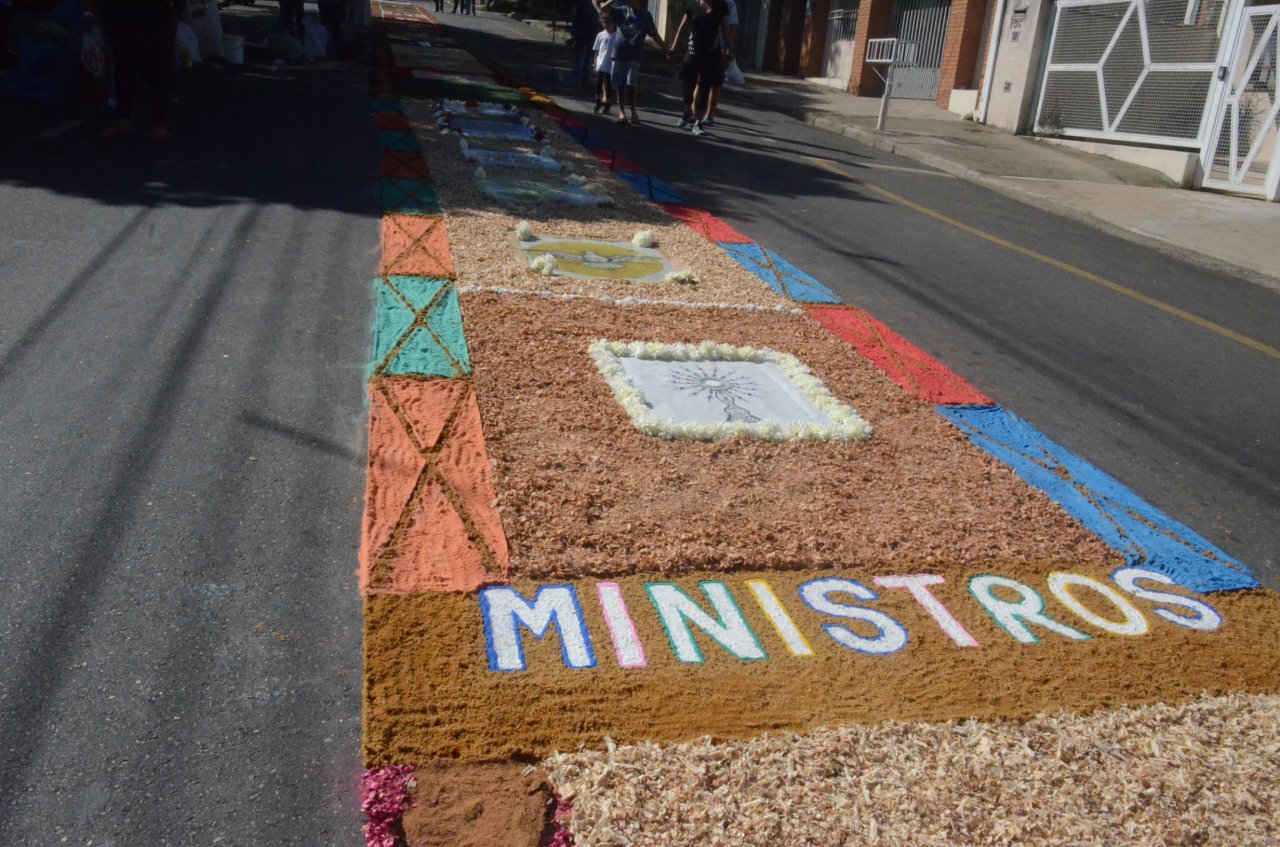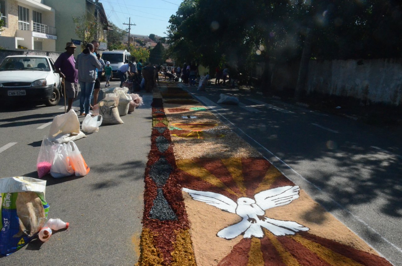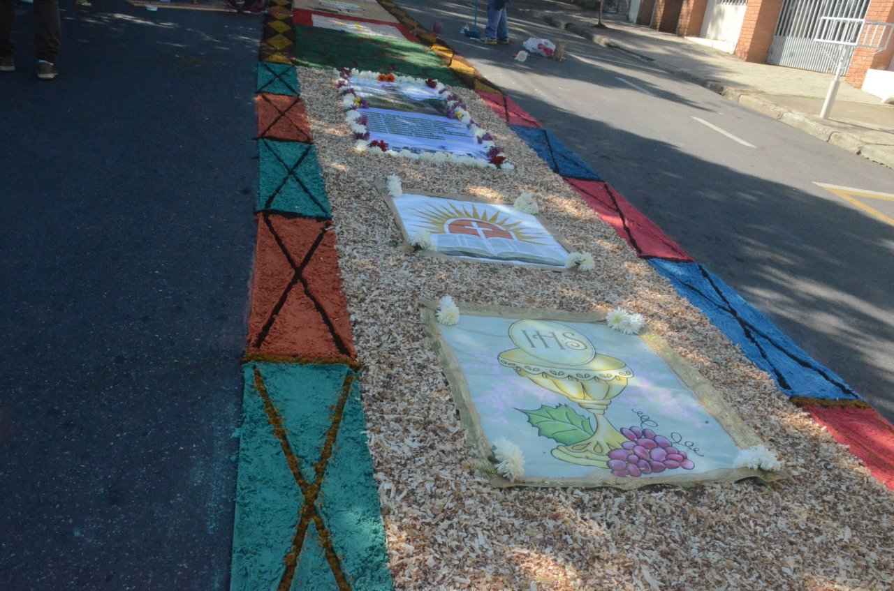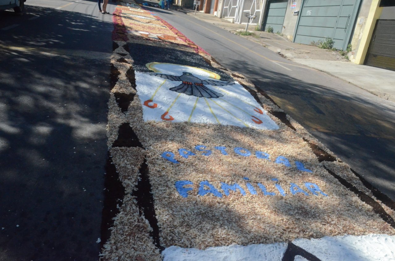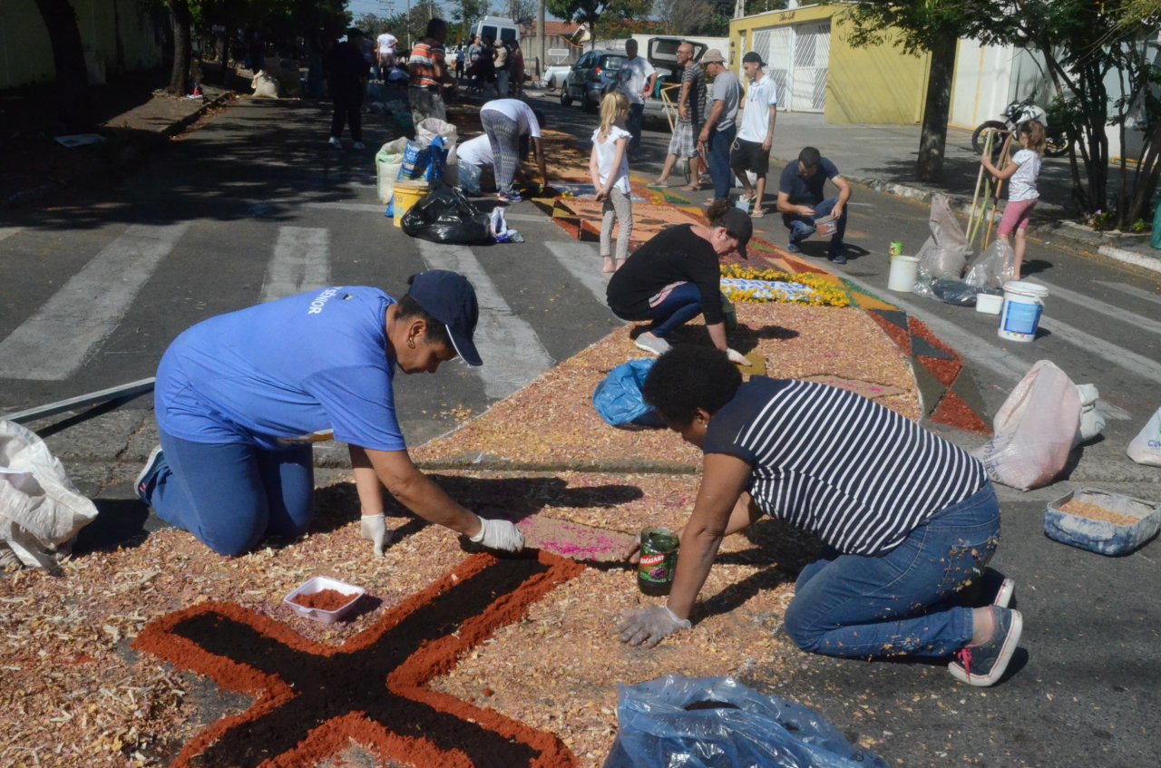A união entre pessoas de diferentes faixas etárias, de crianças até idosos, marcou a comemoração de Corpus Christi, em Jaguariúna.Na quinta-feira, dia 20, centenas de católicos das três paróquias: Santa Maria, Beata Irmã Dulce e Sagrado Coração de Jesus levantaram cedo e se uniram na confecção do tapete, usando muita criatividade e diferentes materiais, como, serragem colorida, cascas de ovos, plantas, flores e pó de café.