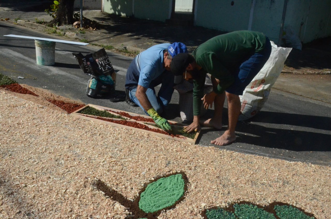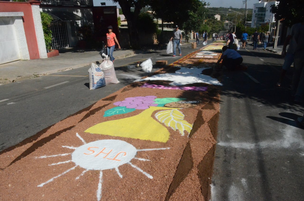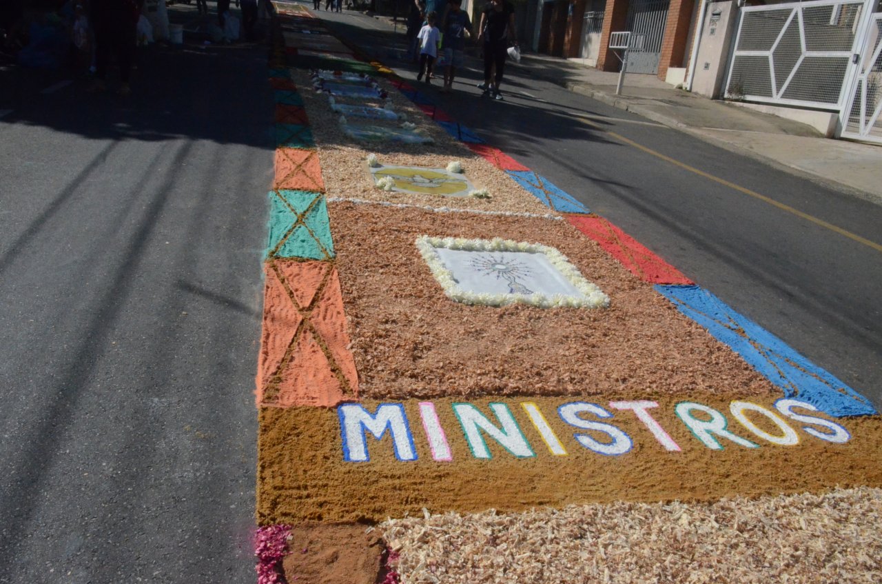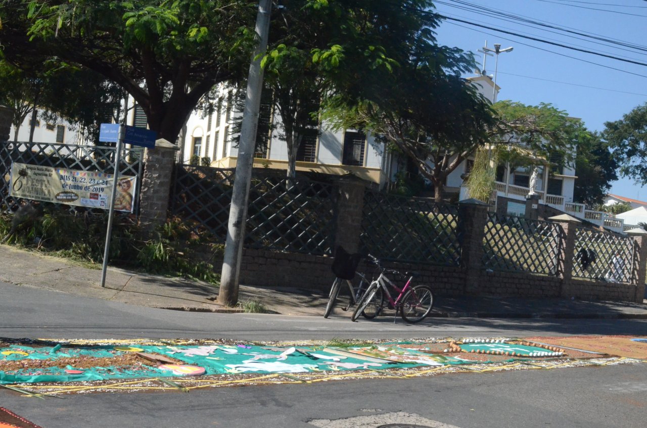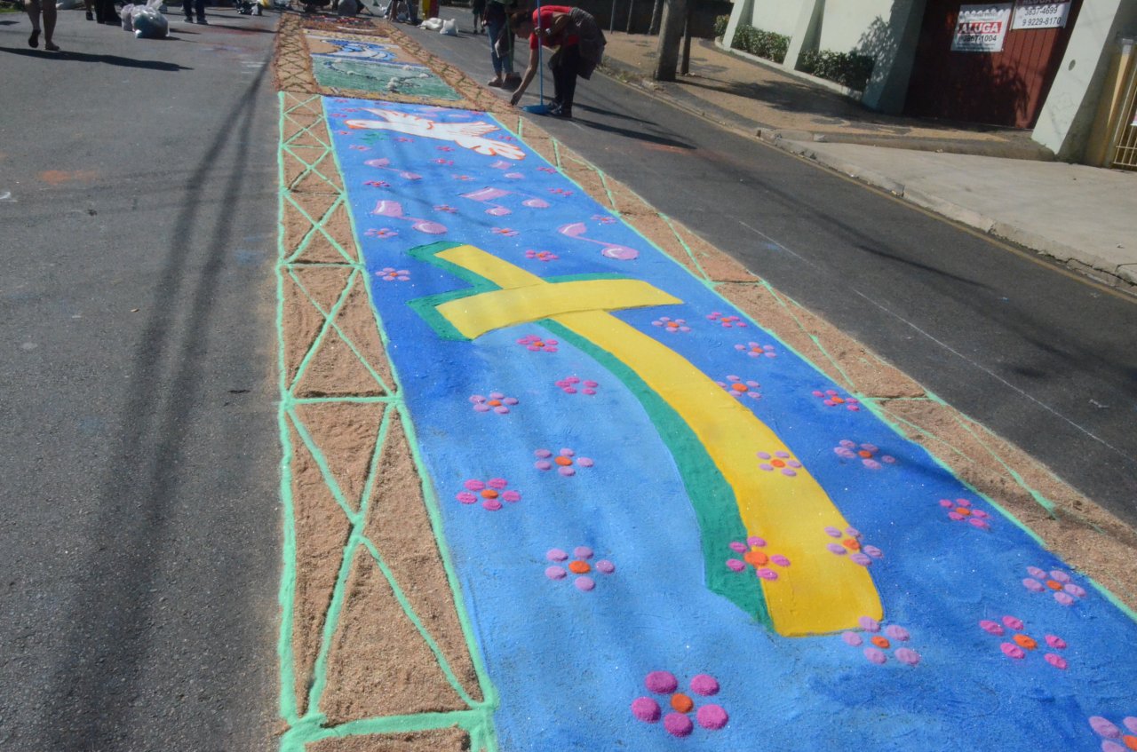 A união entre pessoas de diferentes faixas etárias, de crianças até idosos, marcou a comemoração de Corpus Christi, em Jaguariúna.Na quinta-feira, dia 20, centenas de católicos das três paróquias: Santa Maria, Beata Irmã Dulce e Sagrado Coração de Jesus levantaram cedo e se uniram na confecção do tapete, usando muita criatividade e diferentes materiais, como, serragem colorida, cascas de ovos, plantas, flores e pó de café.