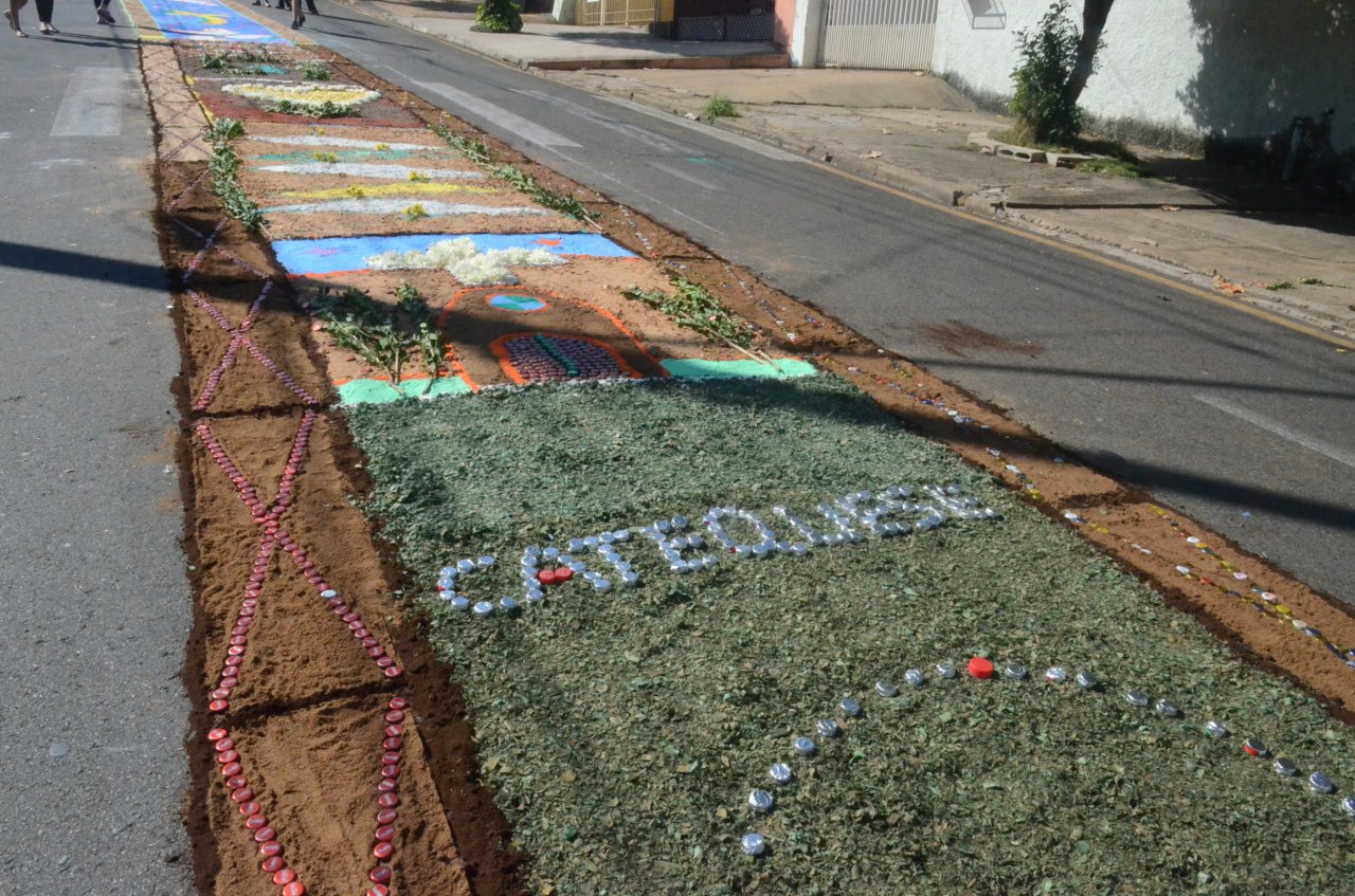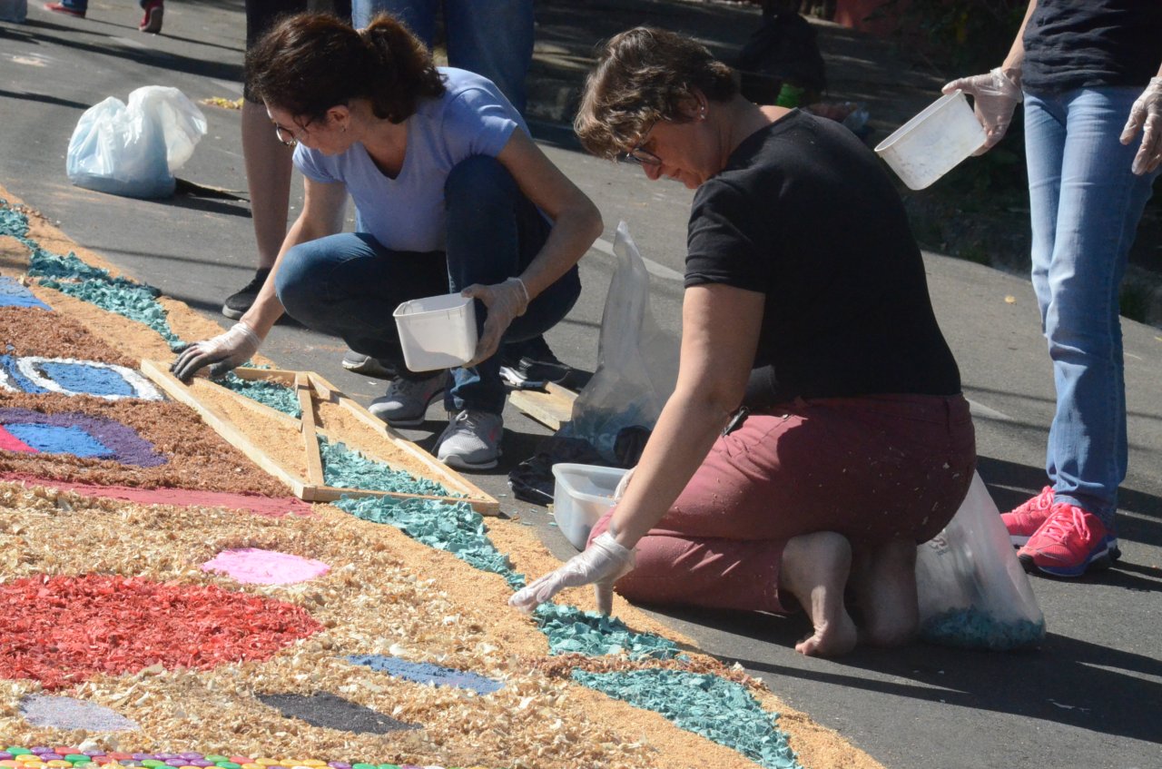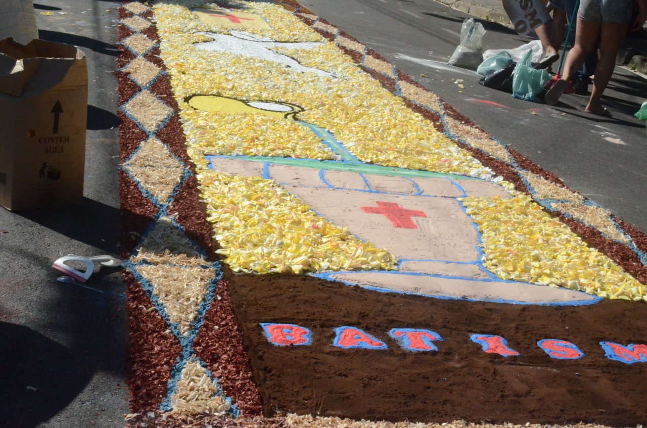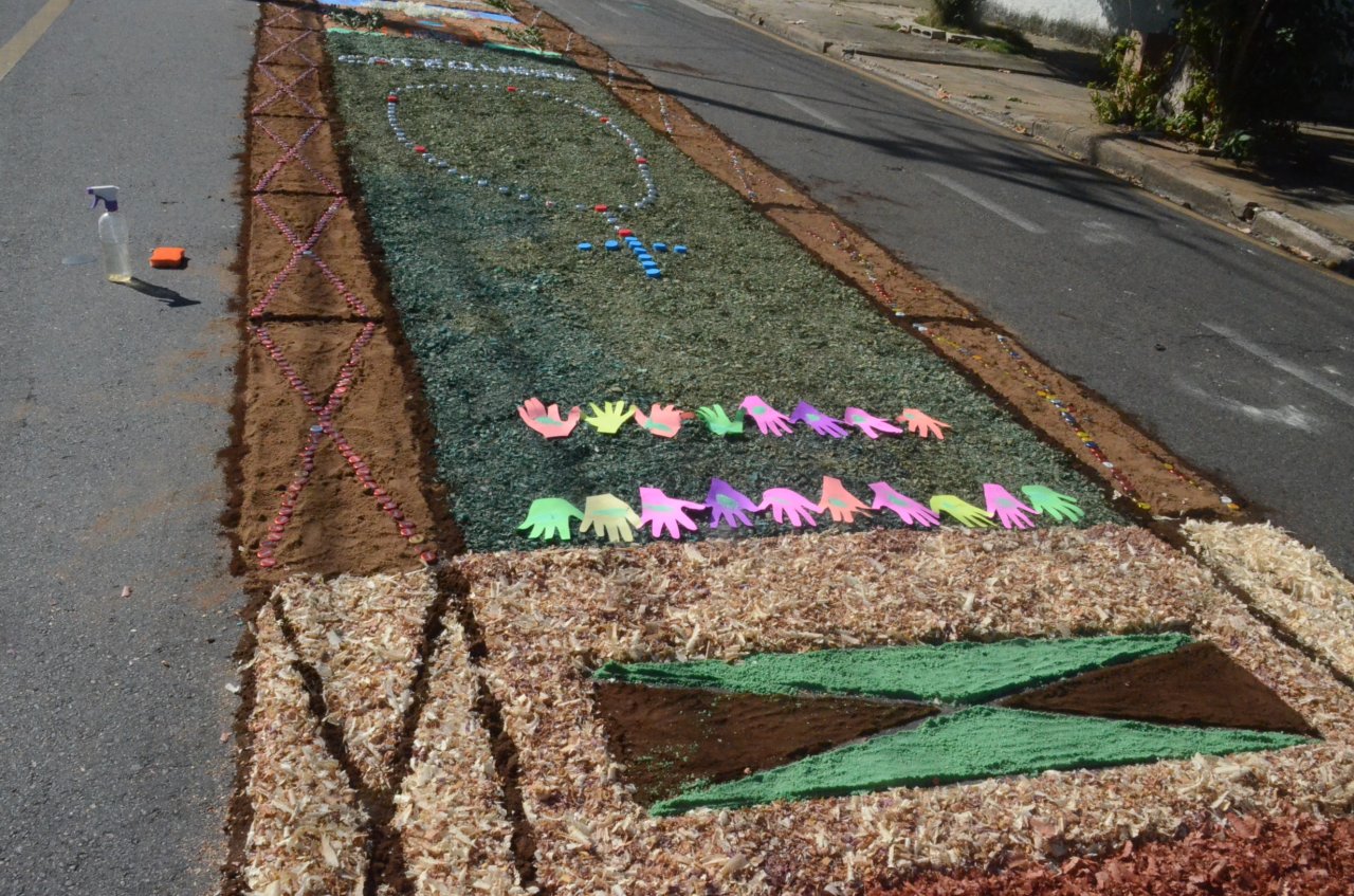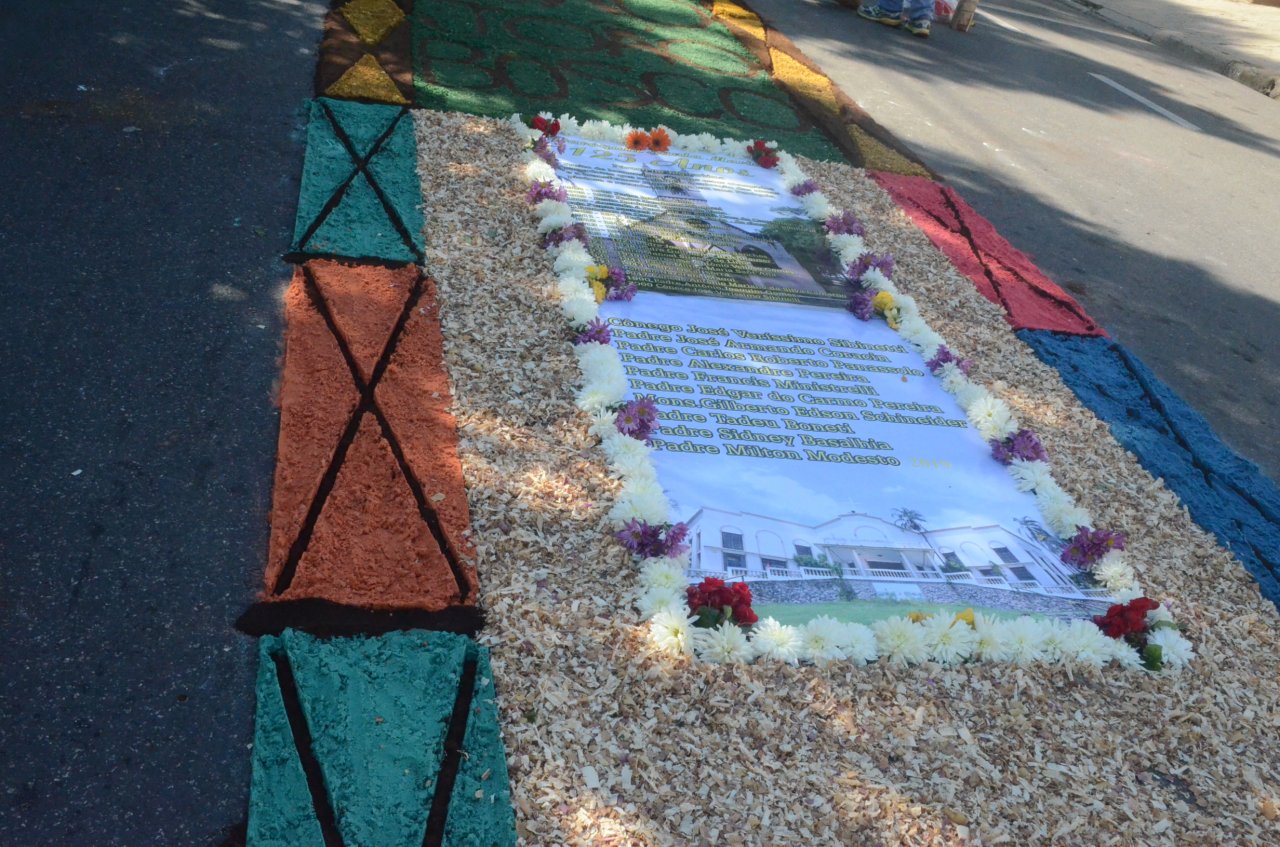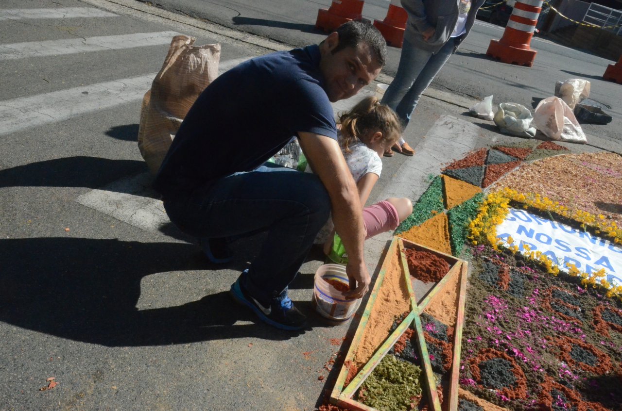 A união entre pessoas de diferentes faixas etárias, de crianças até idosos, marcou a comemoração de Corpus Christi, em Jaguariúna.Na quinta-feira, dia 20, centenas de católicos das três paróquias: Santa Maria, Beata Irmã Dulce e Sagrado Coração de Jesus levantaram cedo e se uniram na confecção do tapete, usando muita criatividade e diferentes materiais, como, serragem colorida, cascas de ovos, plantas, flores e pó de café.