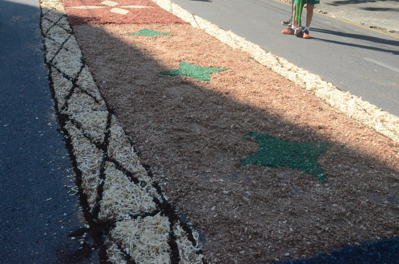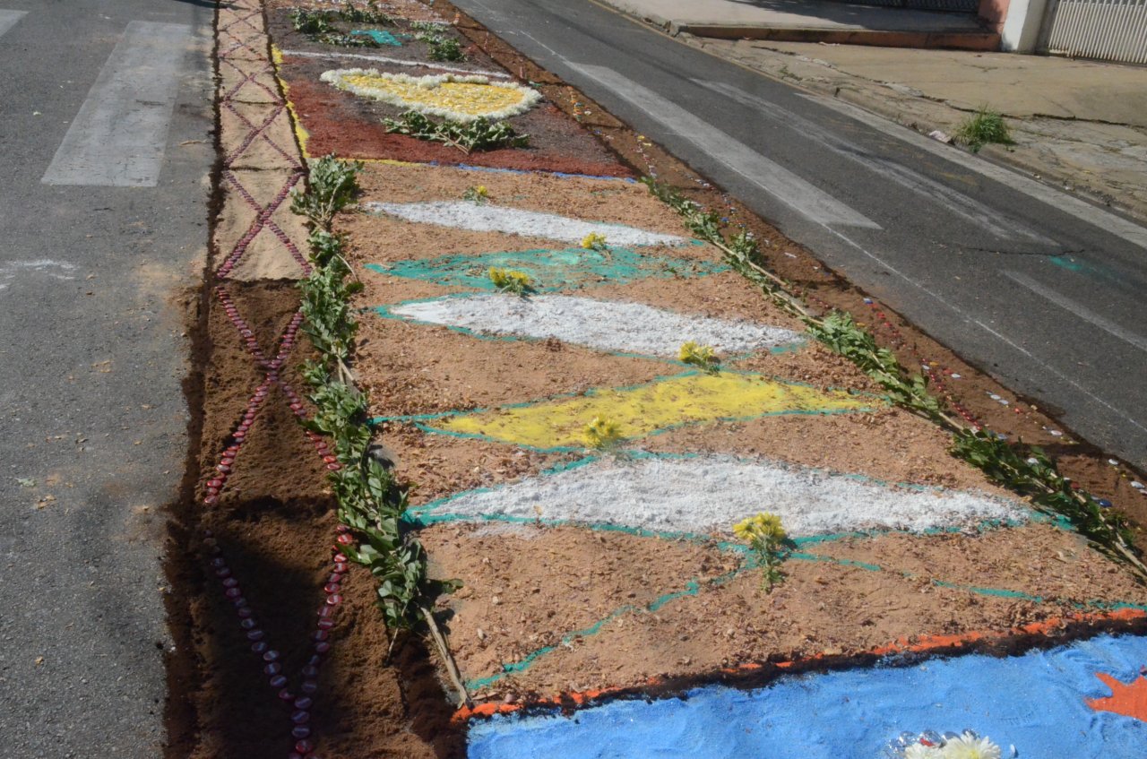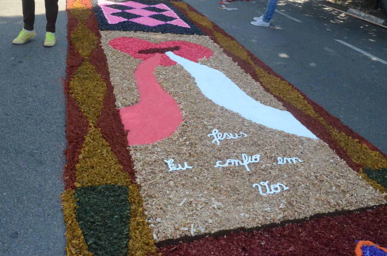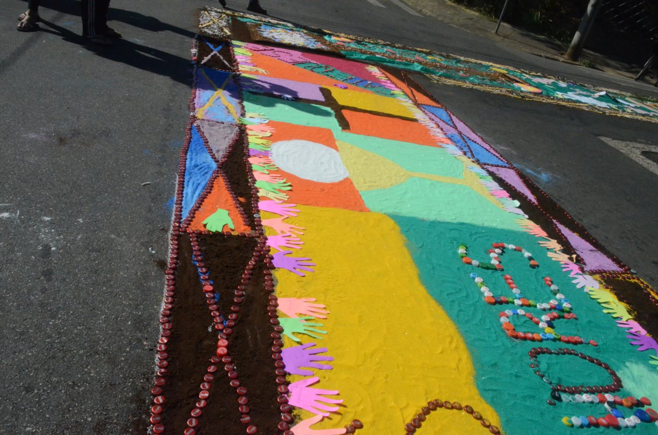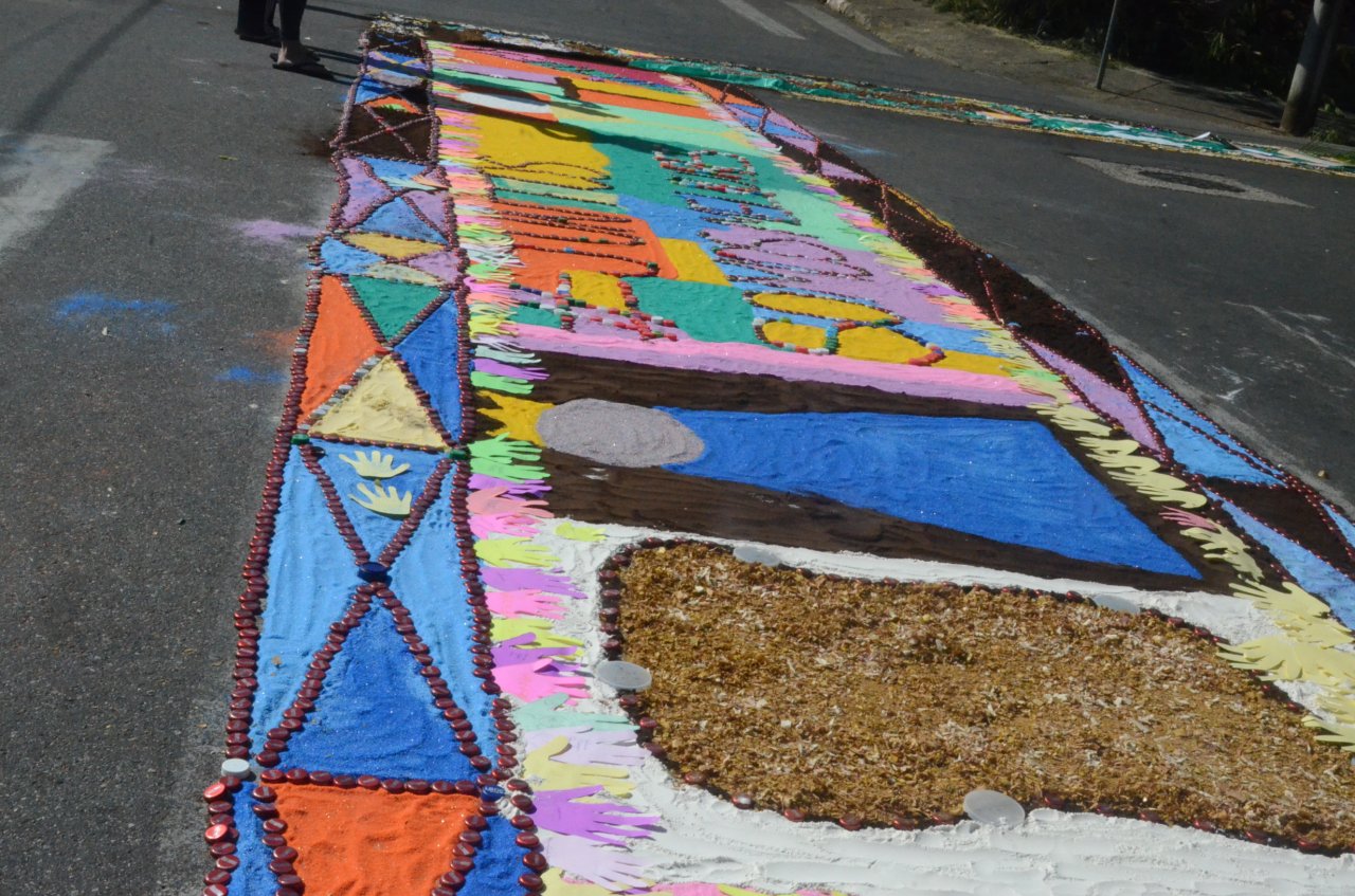 O resultado final foi bastante positivo, ou seja, um enorme tapete muito colorido e festivo, com diversas mensagens, imagens religiosas e frases para reflexão, para a passagem do Santíssimo Sacramento.