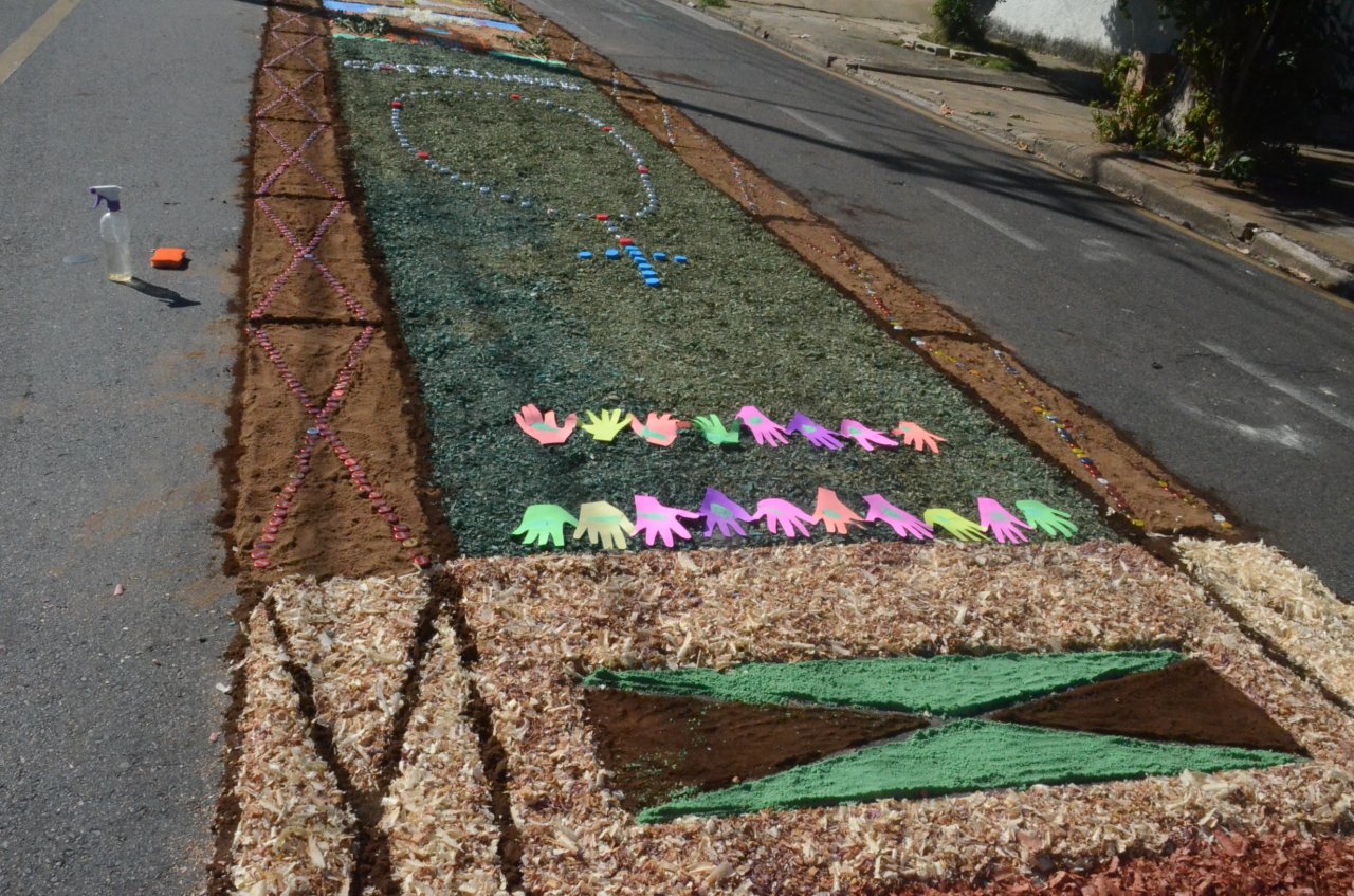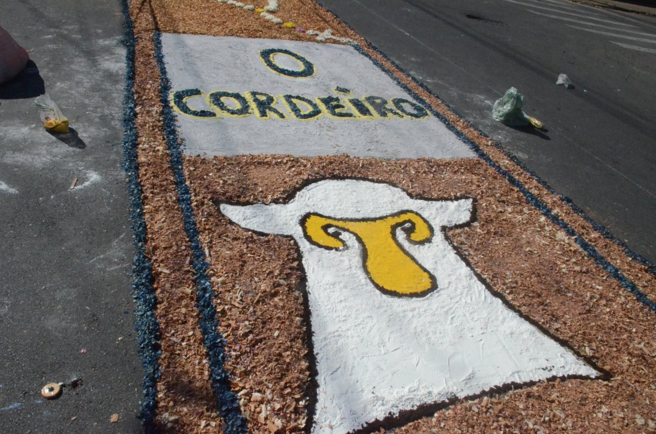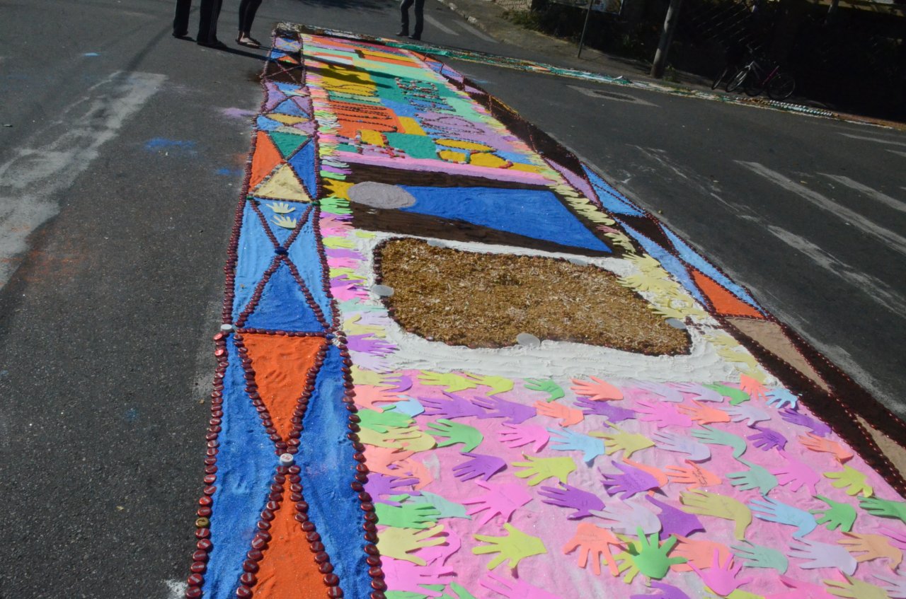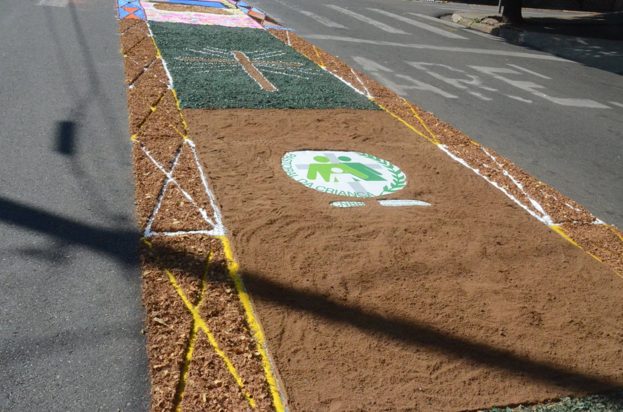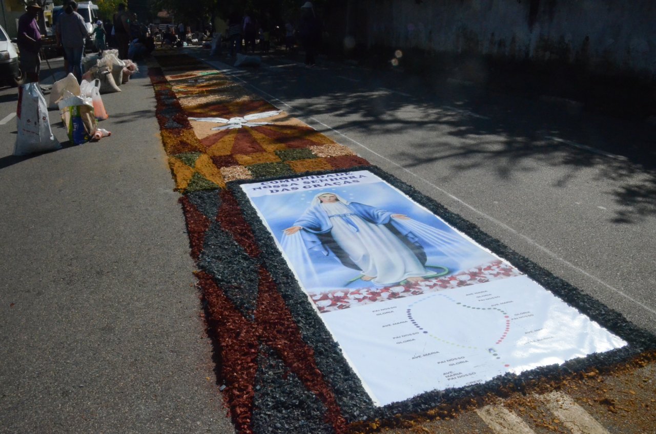 O resultado final foi bastante positivo, ou seja, um enorme tapete muito colorido e festivo, com diversas mensagens, imagens religiosas e frases para reflexão, para a passagem do Santíssimo Sacramento.