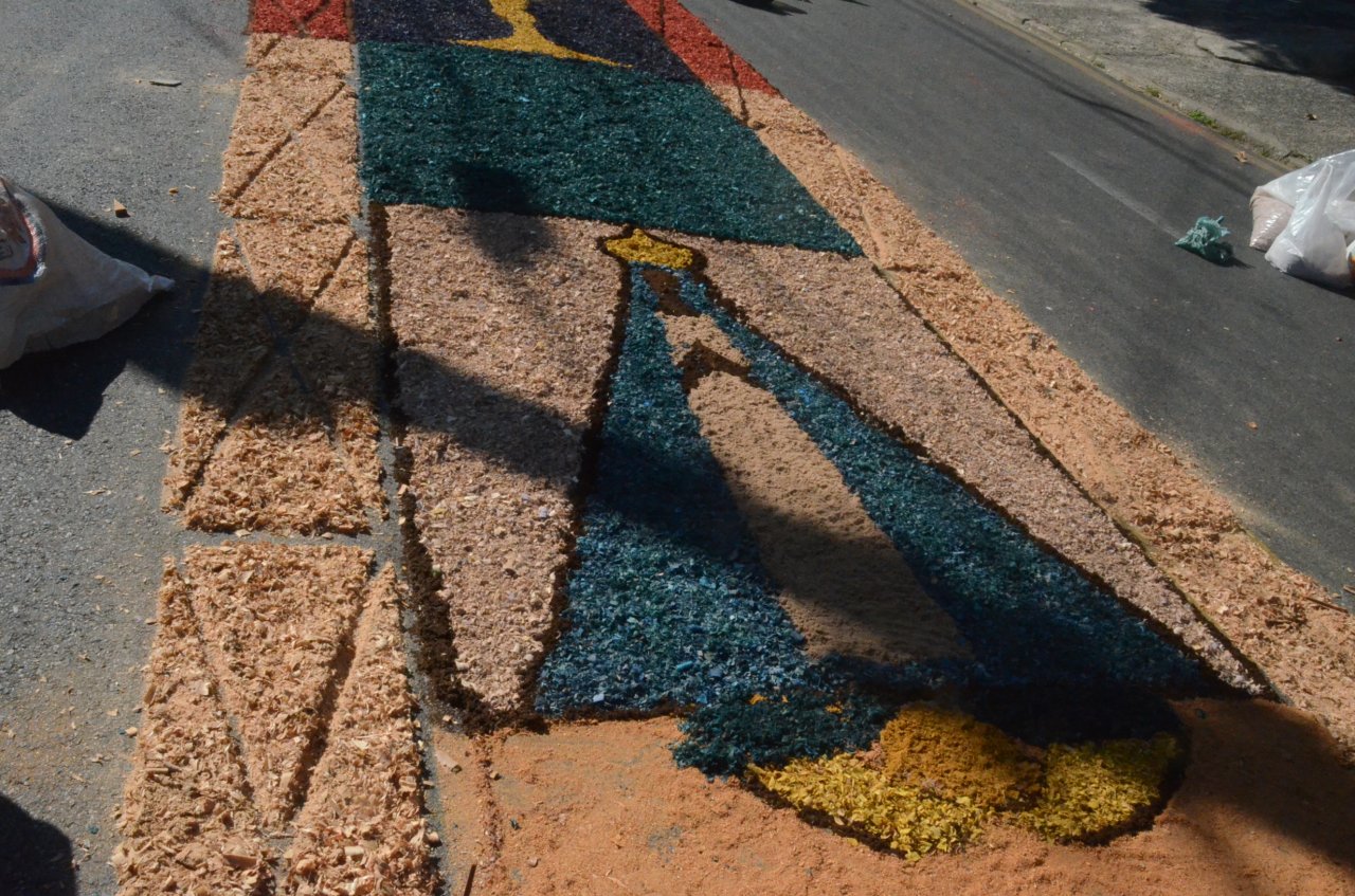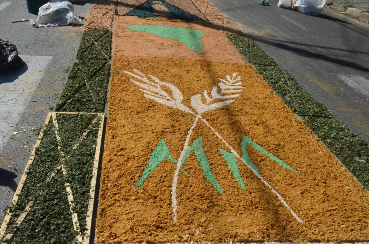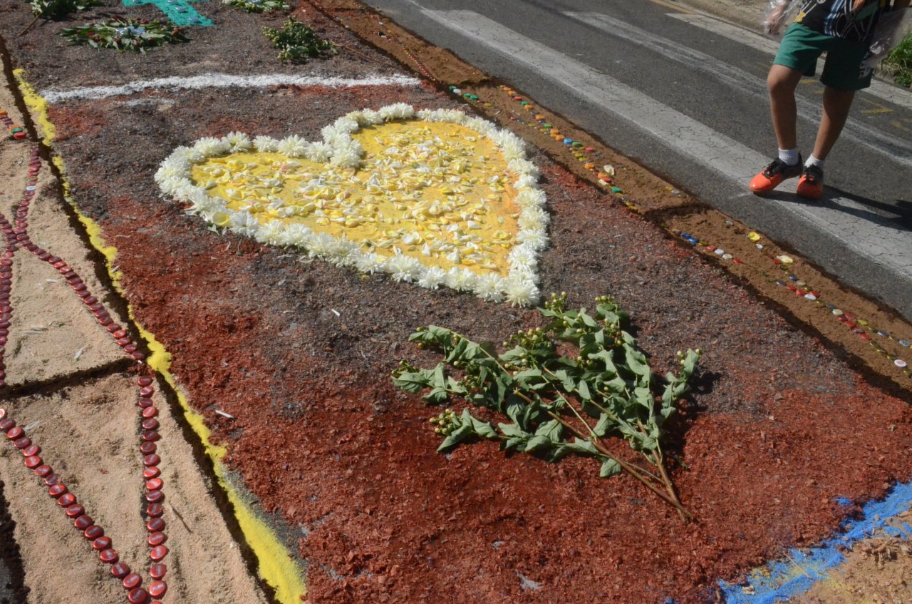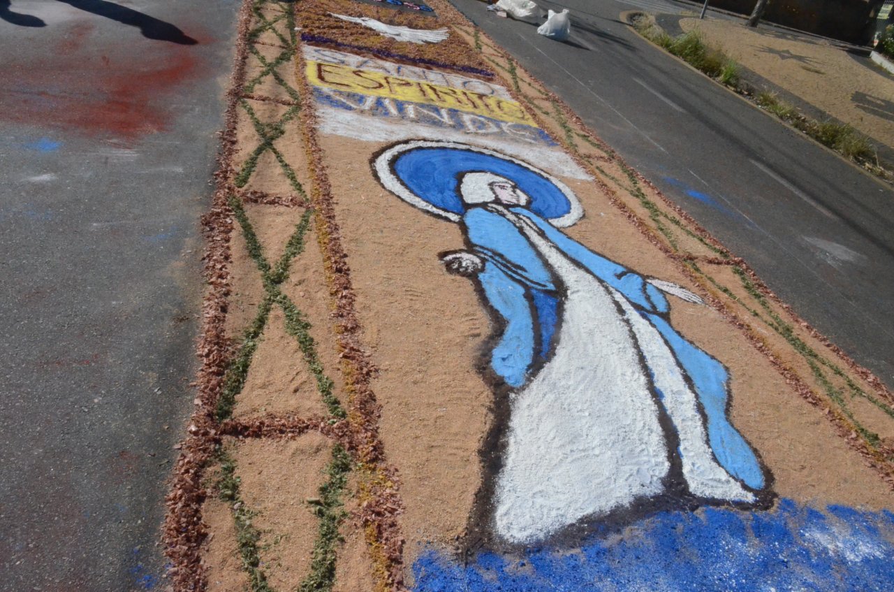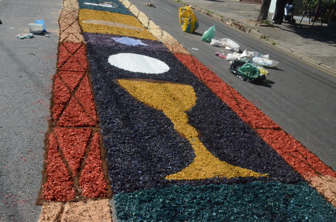 O resultado final foi bastante positivo, ou seja, um enorme tapete muito colorido e festivo, com diversas mensagens, imagens religiosas e frases para reflexão, para a passagem do Santíssimo Sacramento.