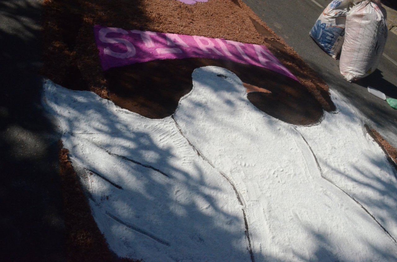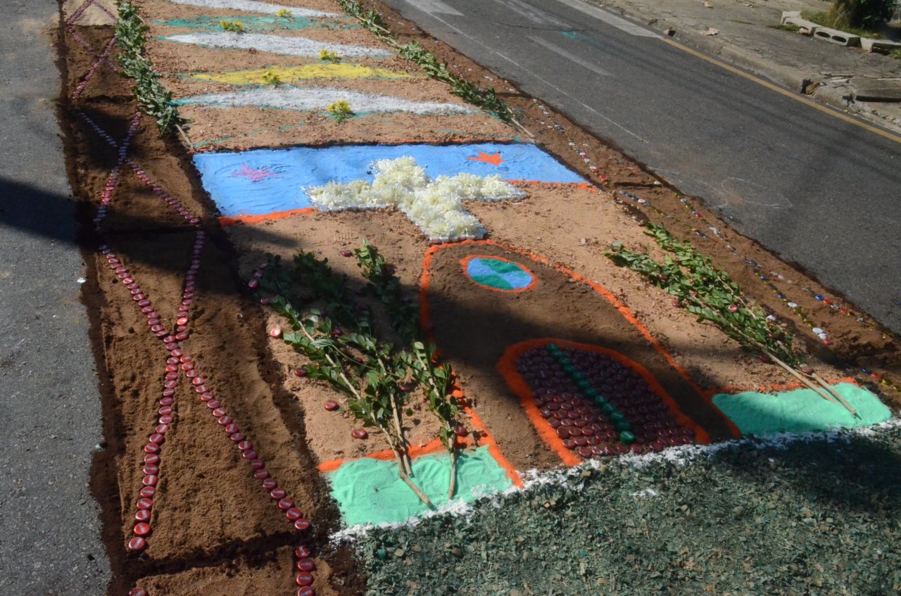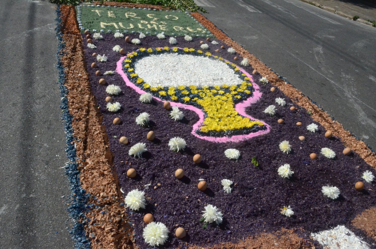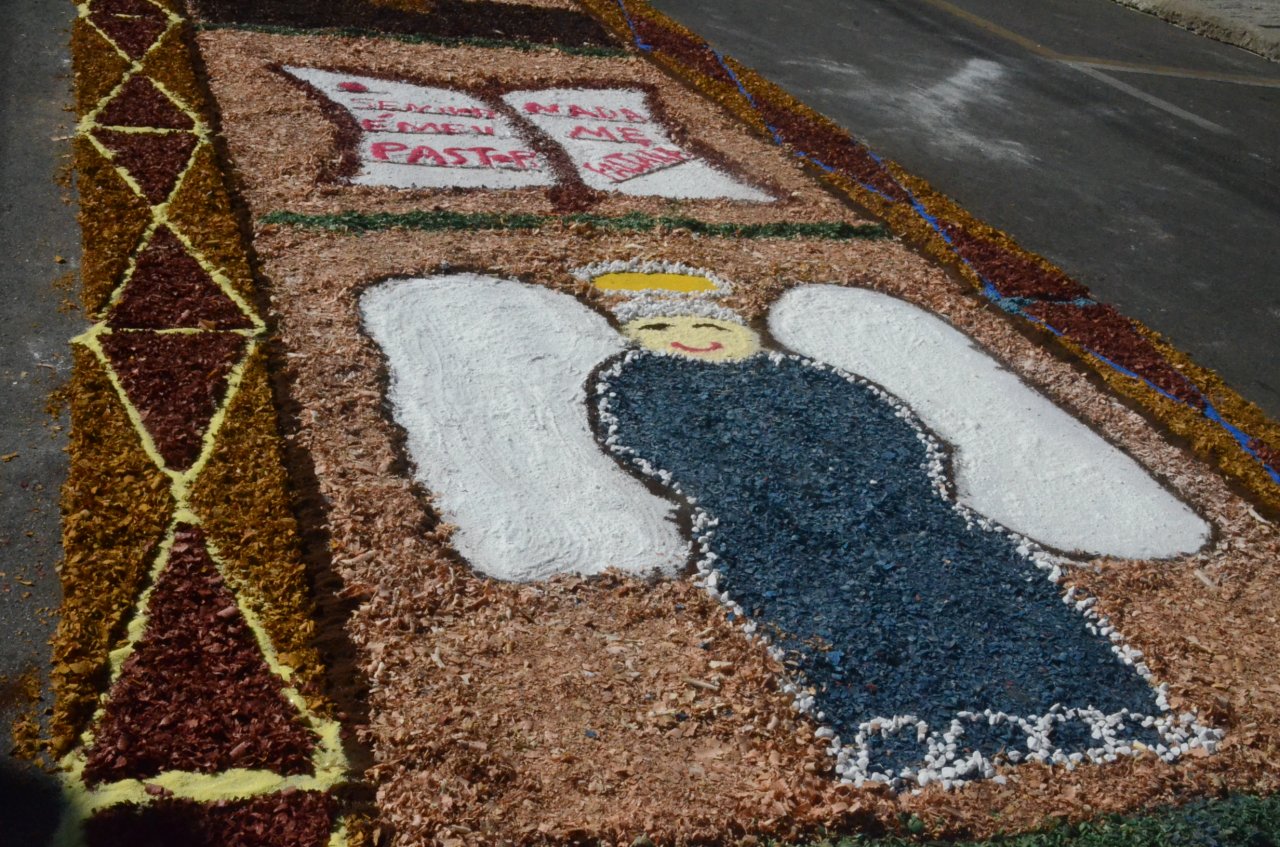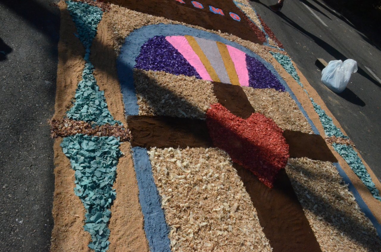 O resultado final foi bastante positivo, ou seja, um enorme tapete muito colorido e festivo, com diversas mensagens, imagens religiosas e frases para reflexão, para a passagem do Santíssimo Sacramento.