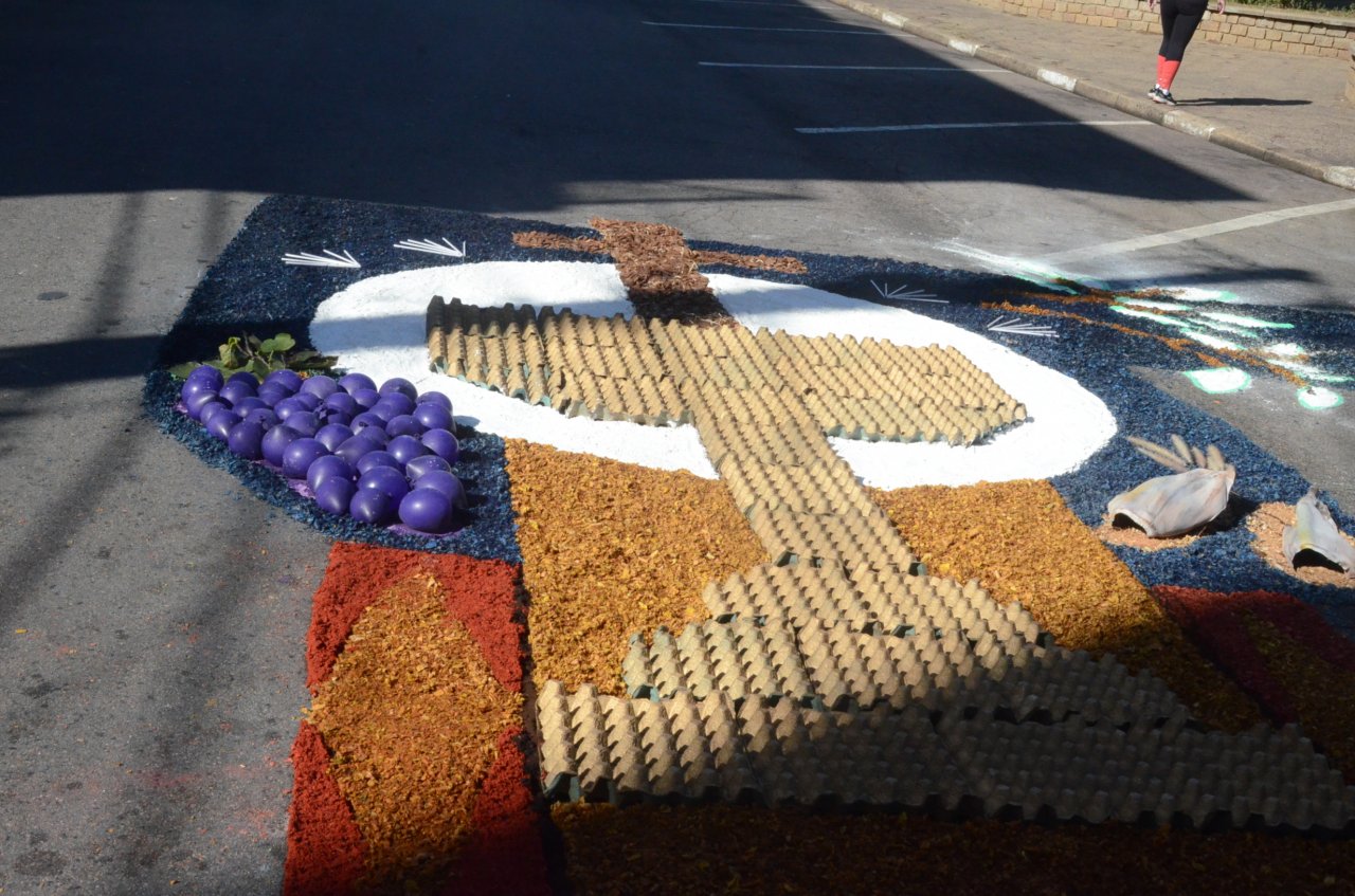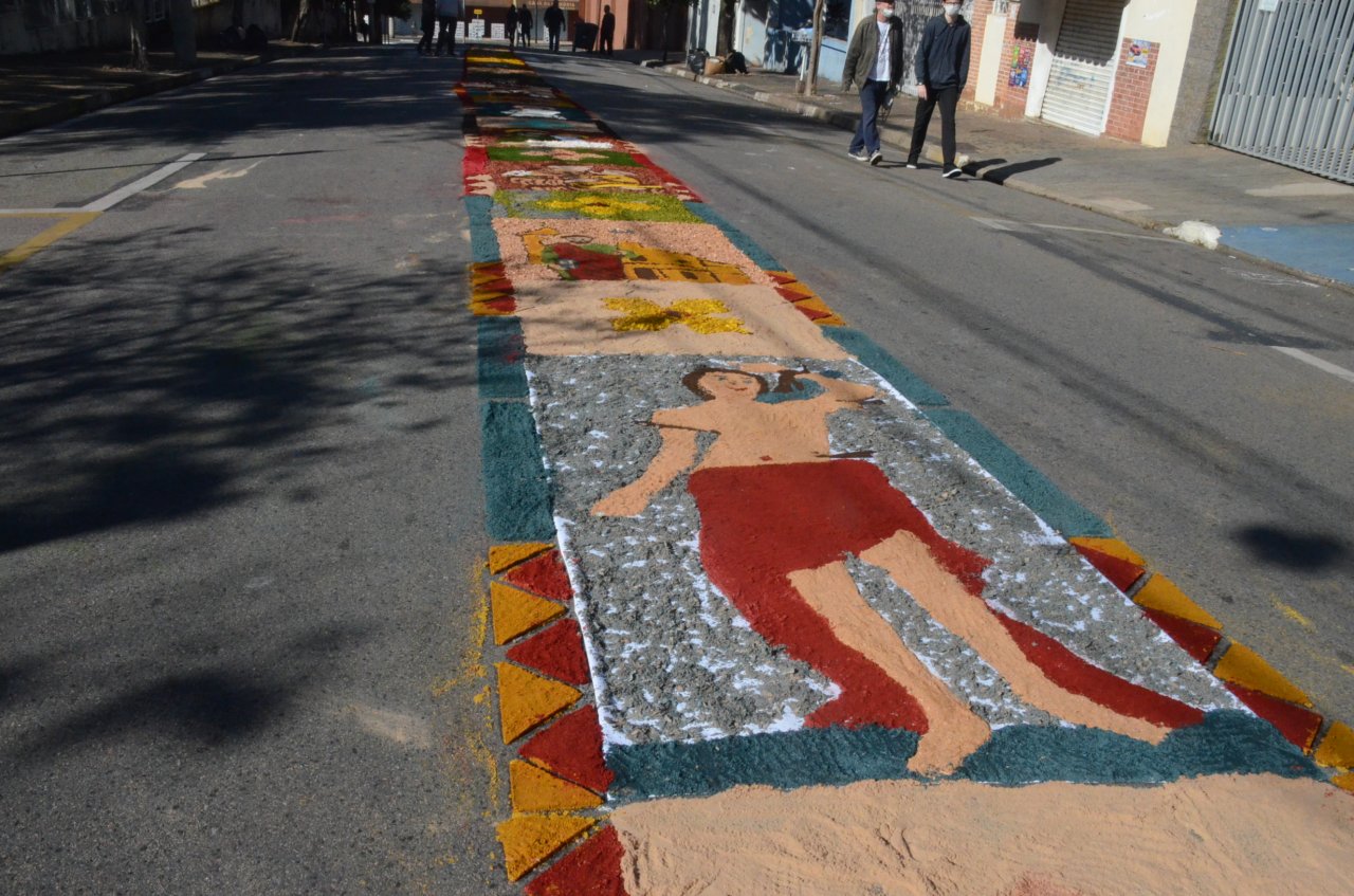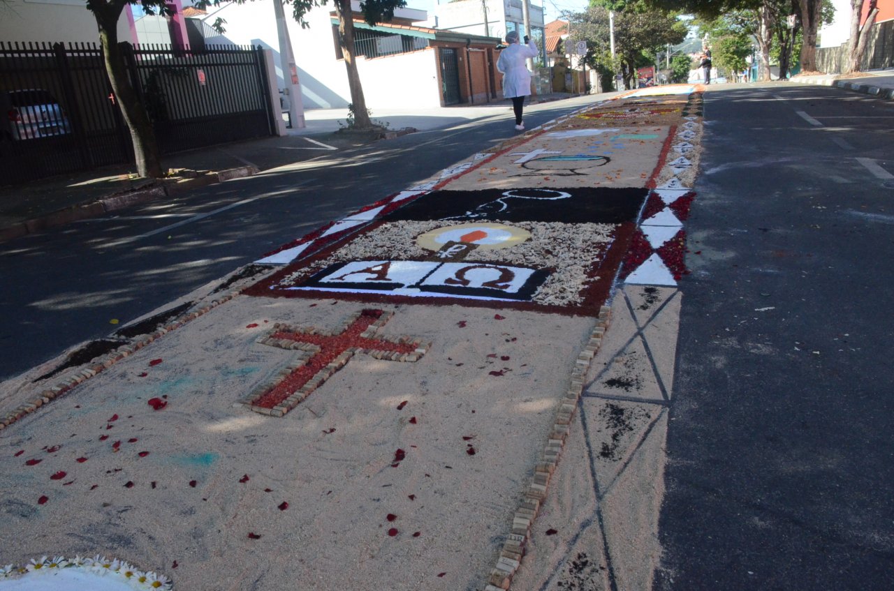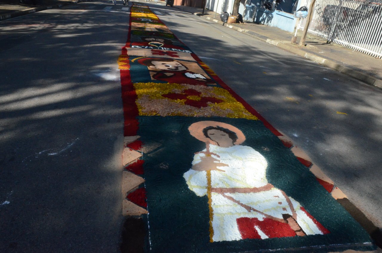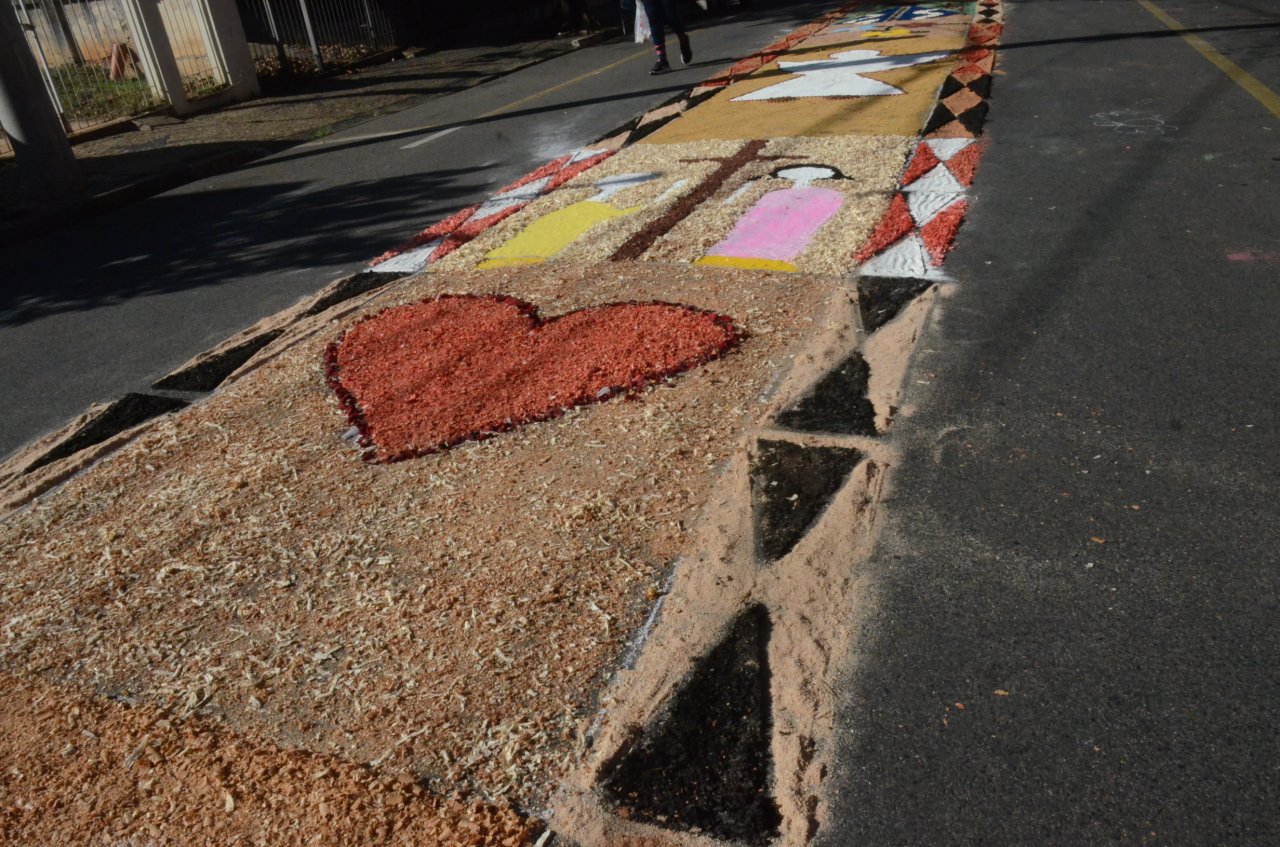Neste ano, os católicos iniciaram a preparação do tapete na noite da quarta-feira, dia 15, e utilizaram materiais variados para fazer os desenhos, desde serragem, caixas de ovos, pó de café, tampinhas de garrafas, areia, rolhas até flores.