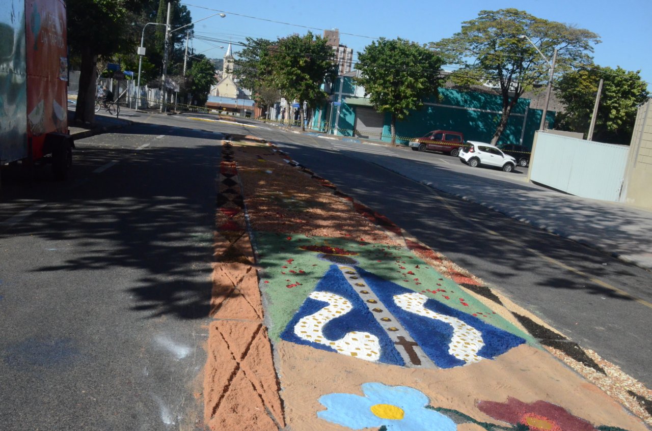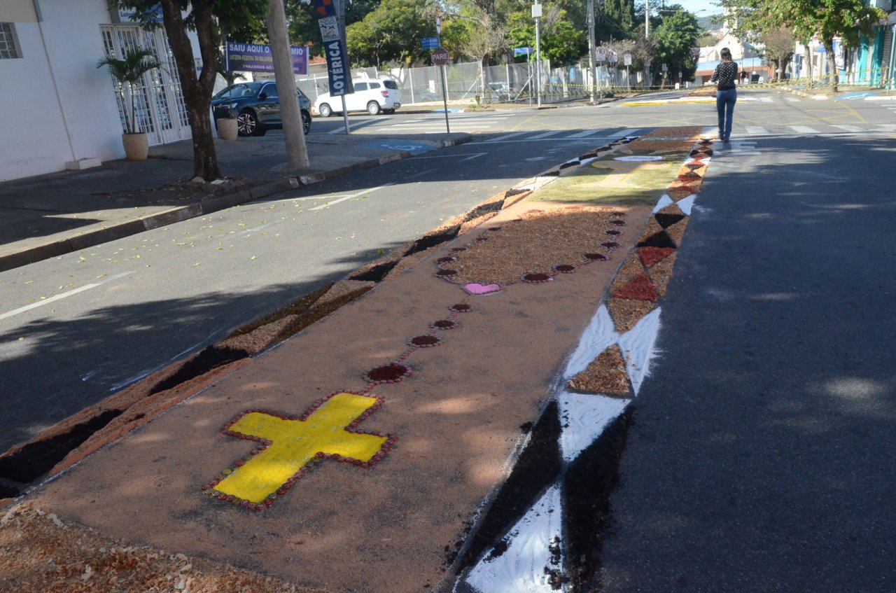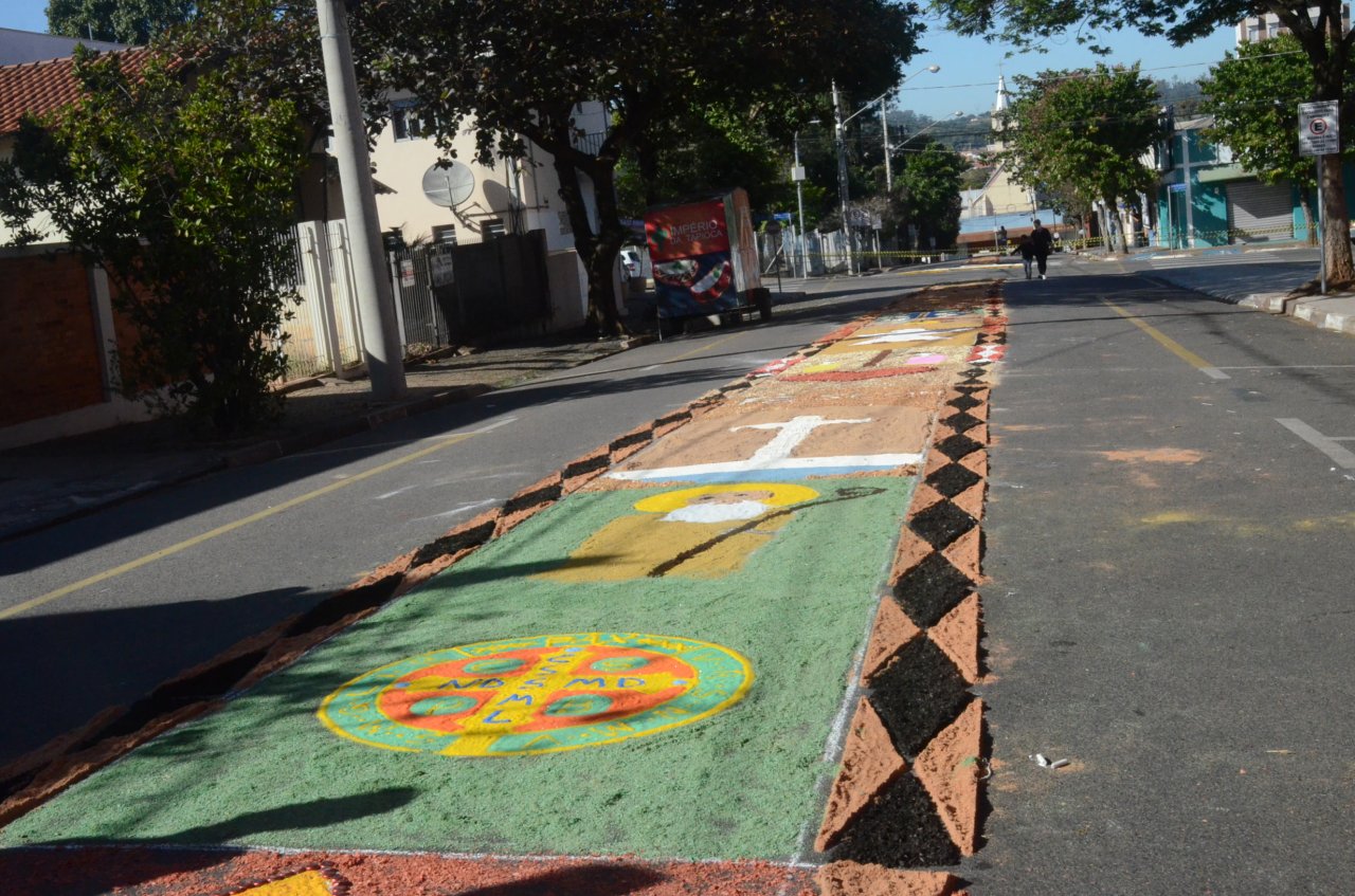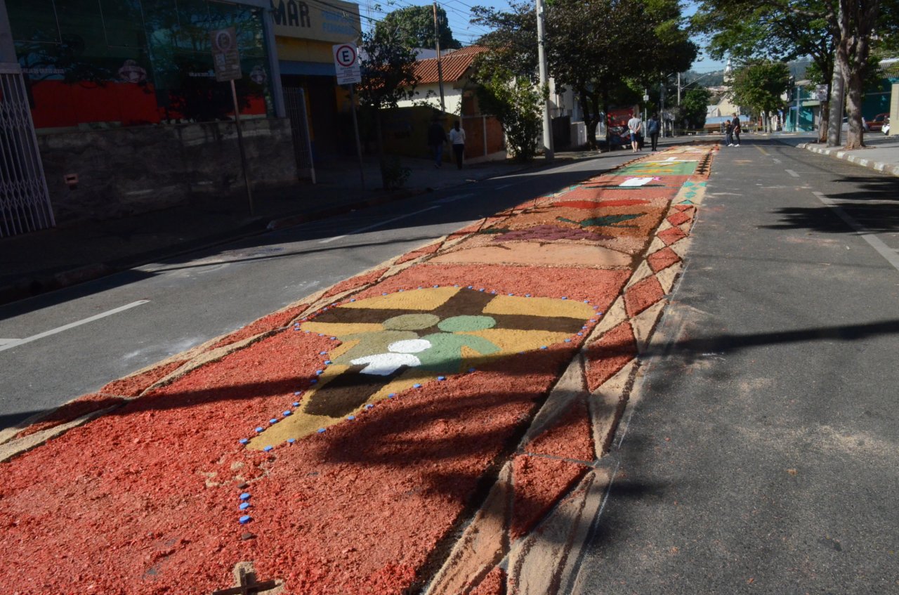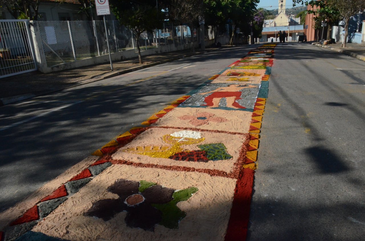 Neste ano, os católicos iniciaram a preparação do tapete na noite da quarta-feira, dia 15, e utilizaram materiais variados para fazer os desenhos, desde serragem, caixas de ovos, pó de café, tampinhas de garrafas, areia, rolhas até flores.