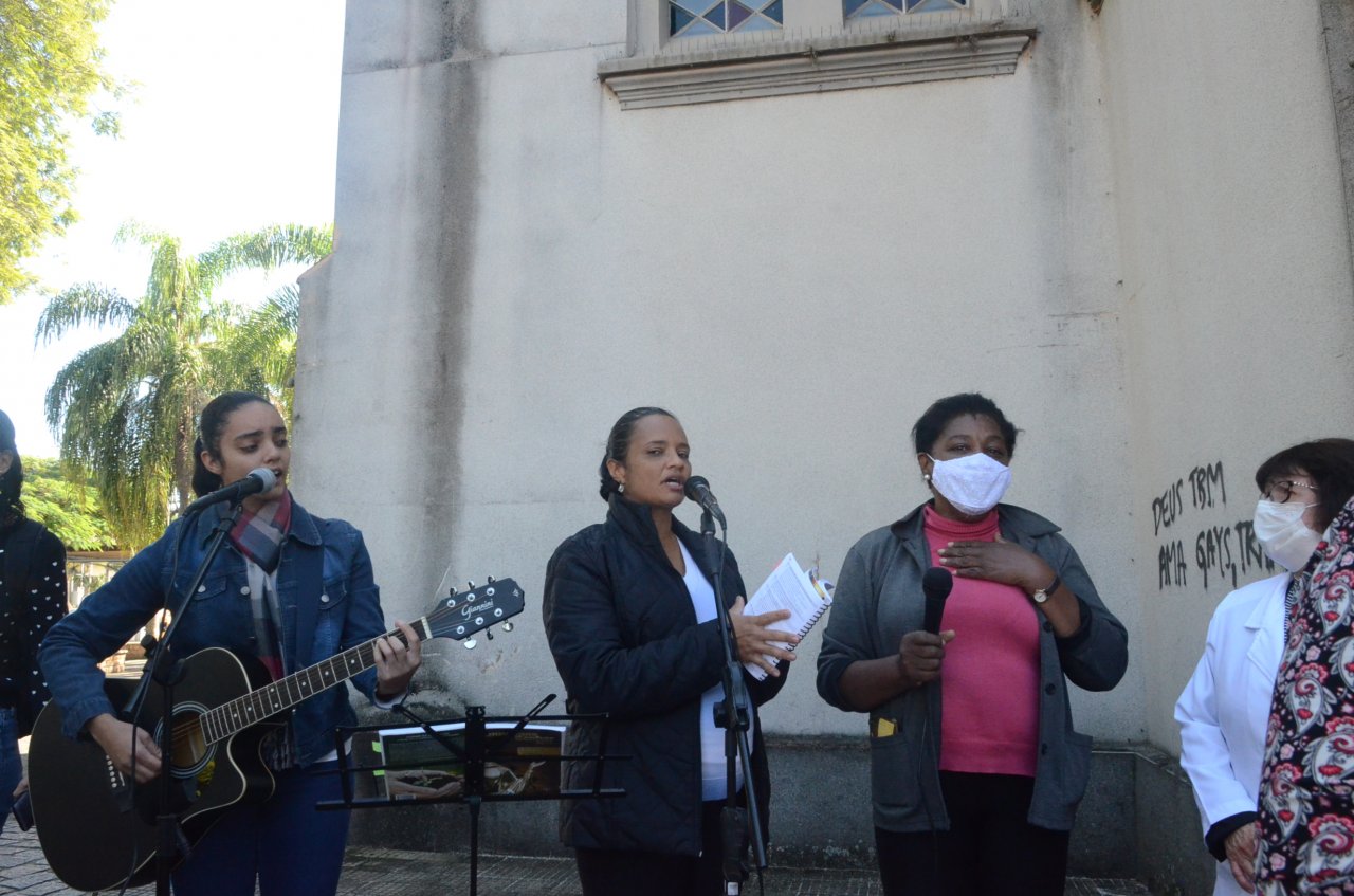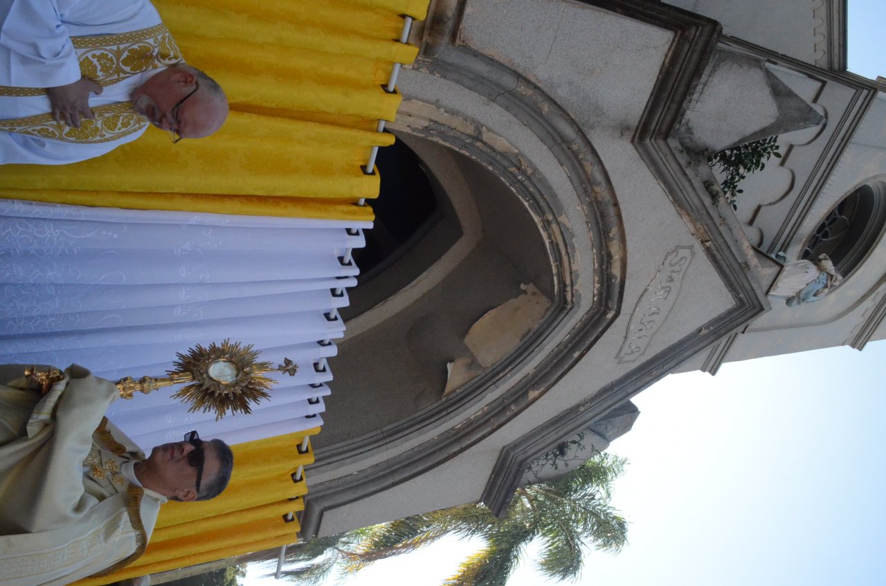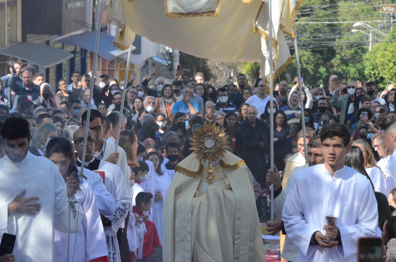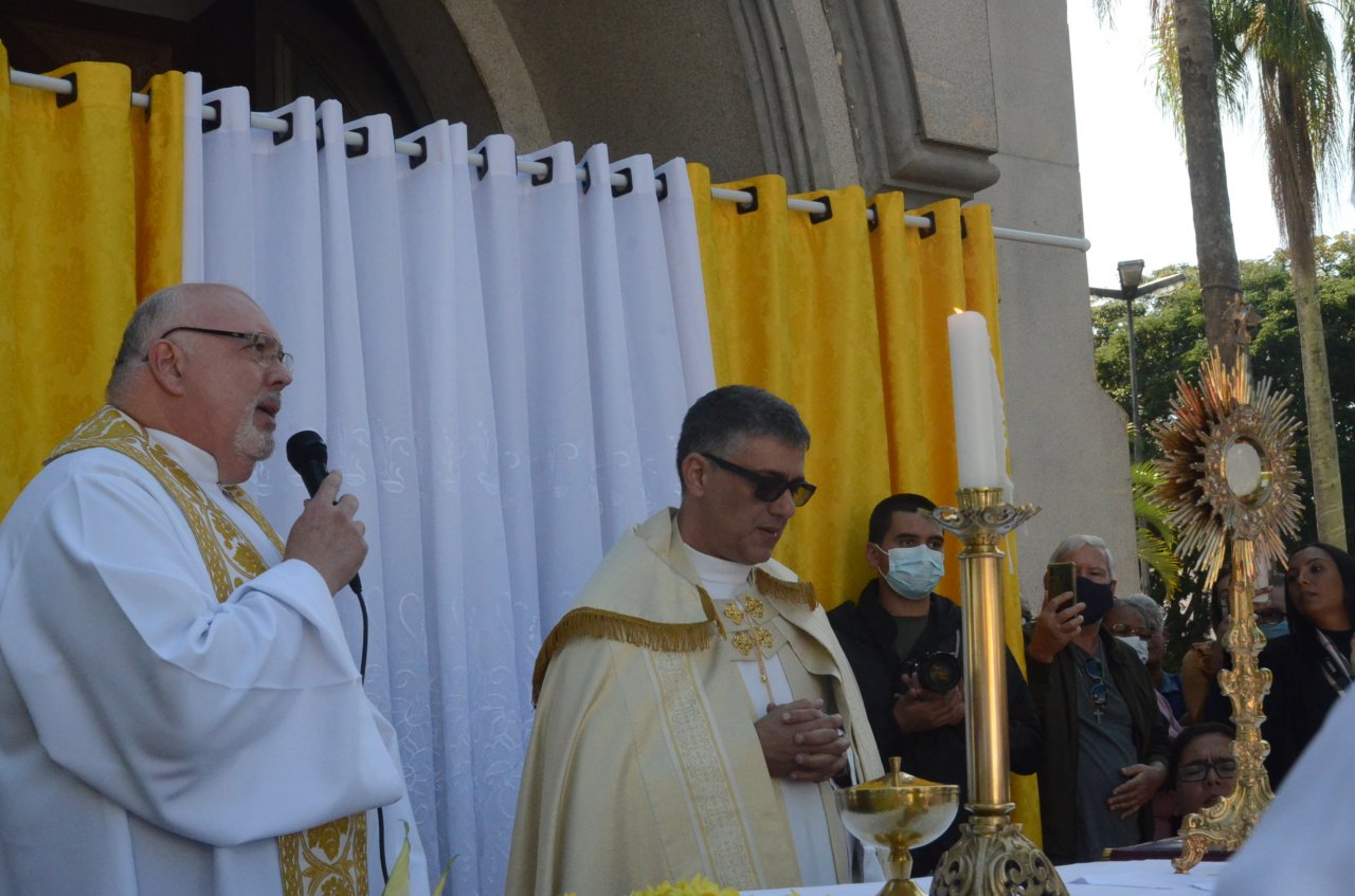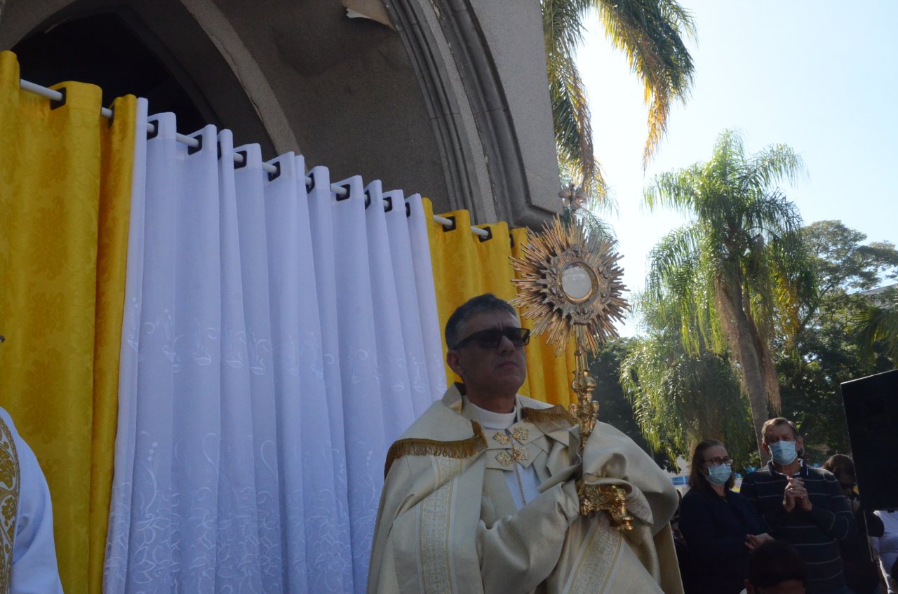 Em frente a Matriz Centenária, os católicos receberam a benção do Santíssimo Sacramento. “Jesus Cristo nos une e nos faz uma única igreja, um único povo e a Eucaristia nos faz igreja e unidade, e nos faz buscar viver essa comunhão de fé entre os irmãos, então, celebrar a Eucaristia e fazer essa festa solene de Jesus presente na hóstia consagrada é fazer com que a nossa igreja continue viva e renovando o memorial da presença de Jesus no meio de nós”, explica o padre da Paróquia de Santa Maria, Ademir Bernardelli.
