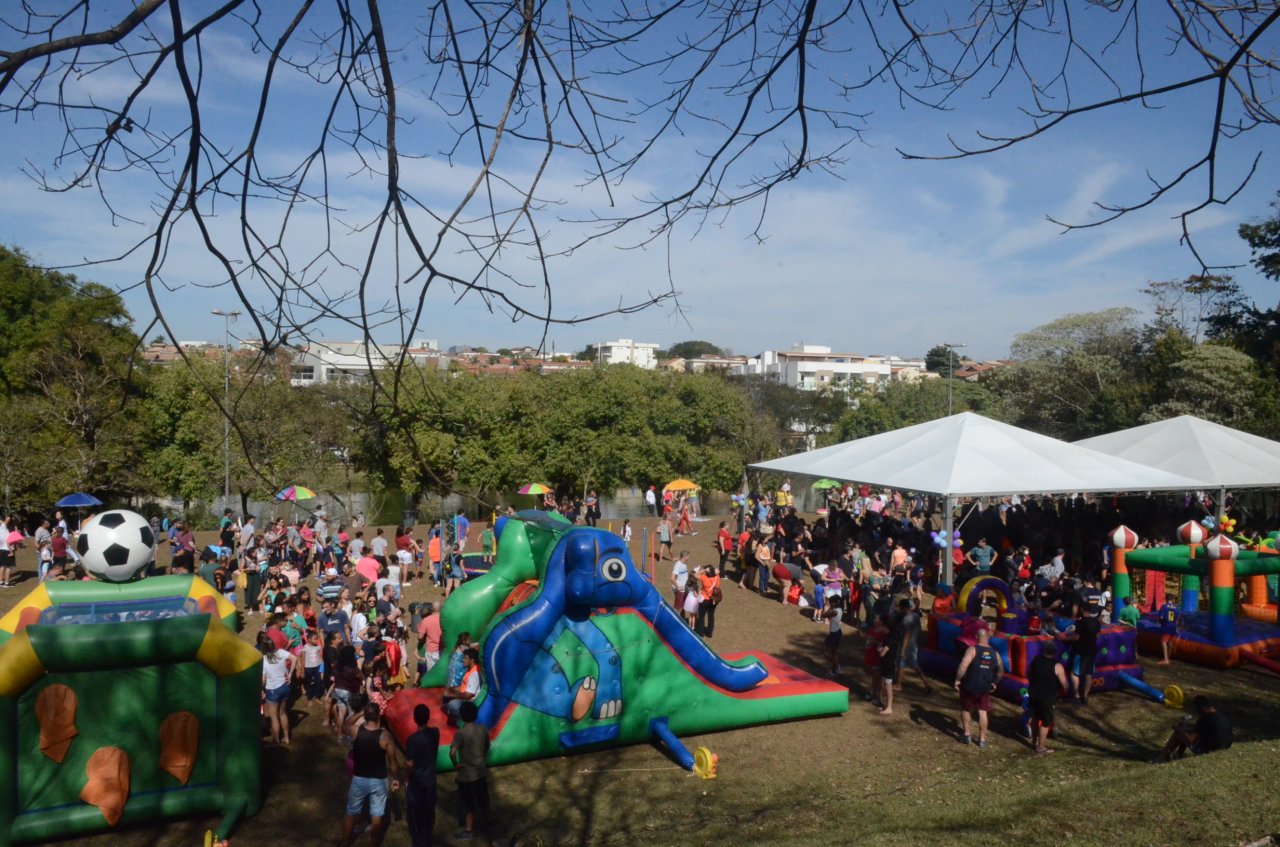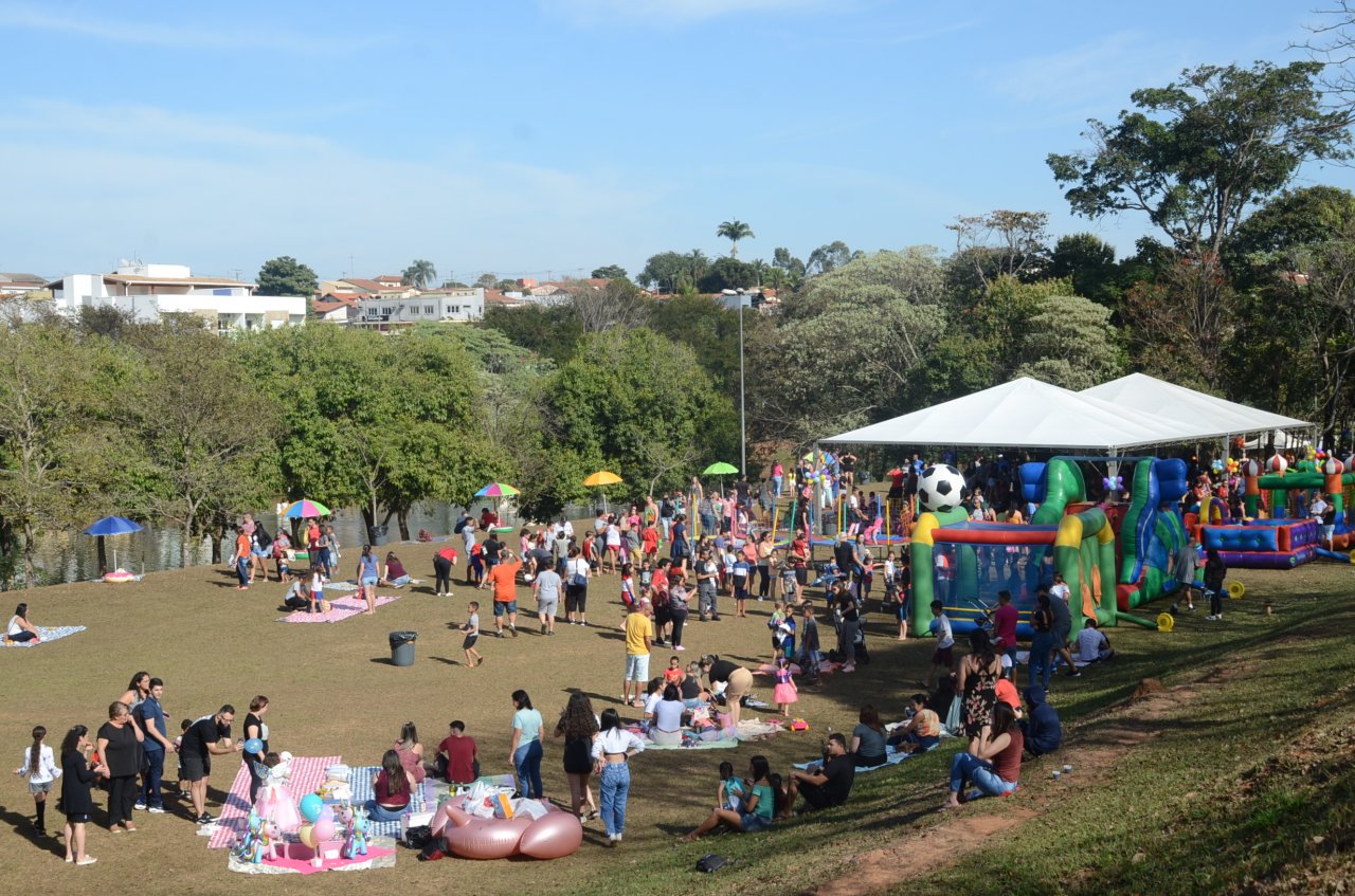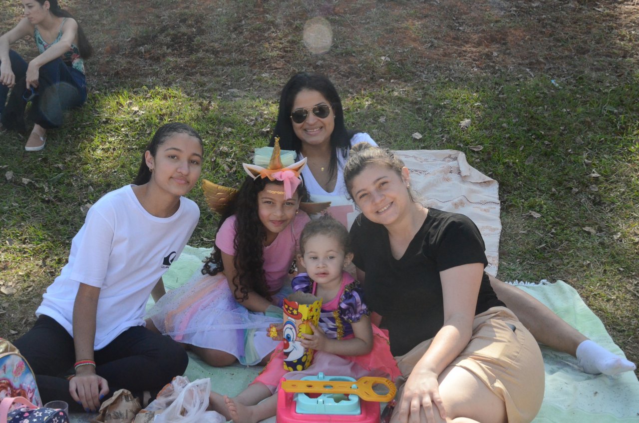 As famílias se espalharam no espaço do parque para fazer o tradicional piquenique e as crianças puderam brincar nos brinquedos infláveis.