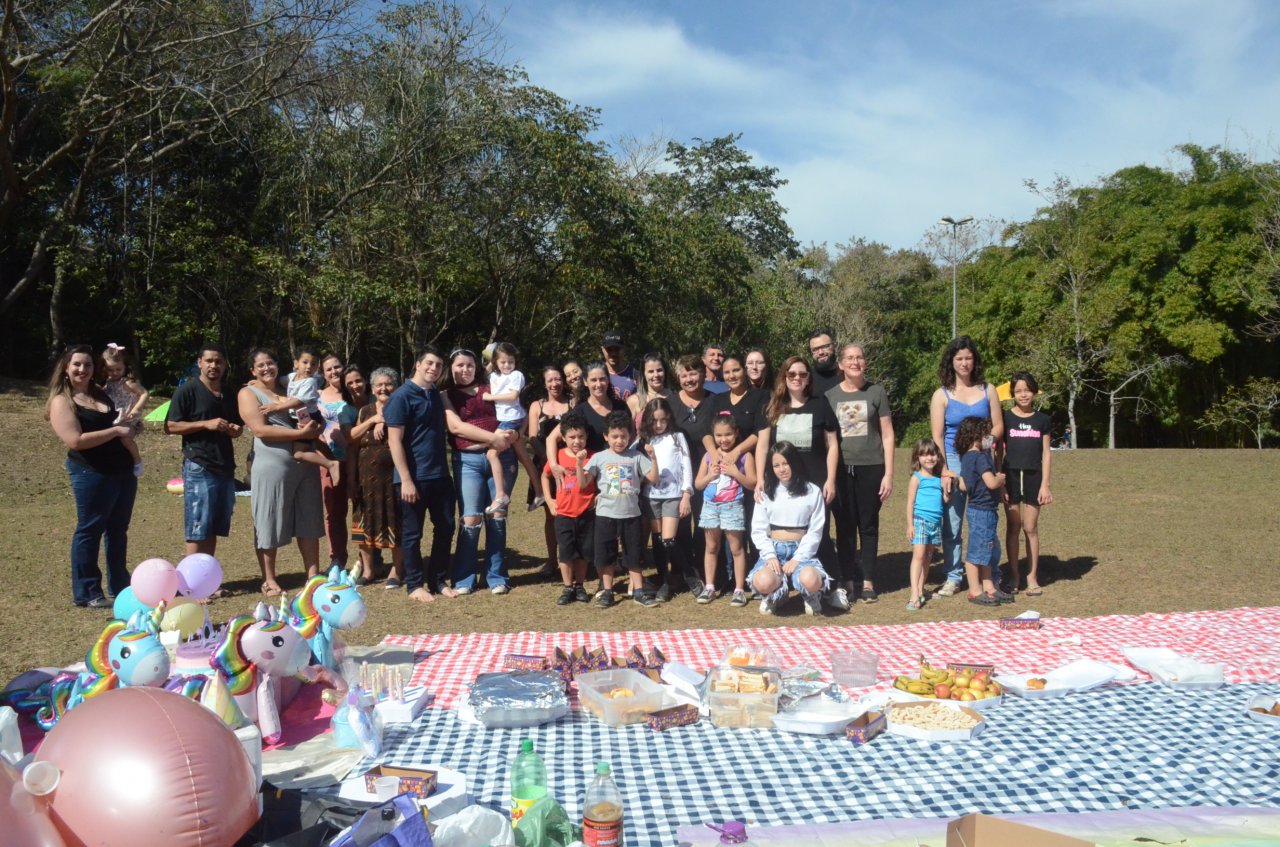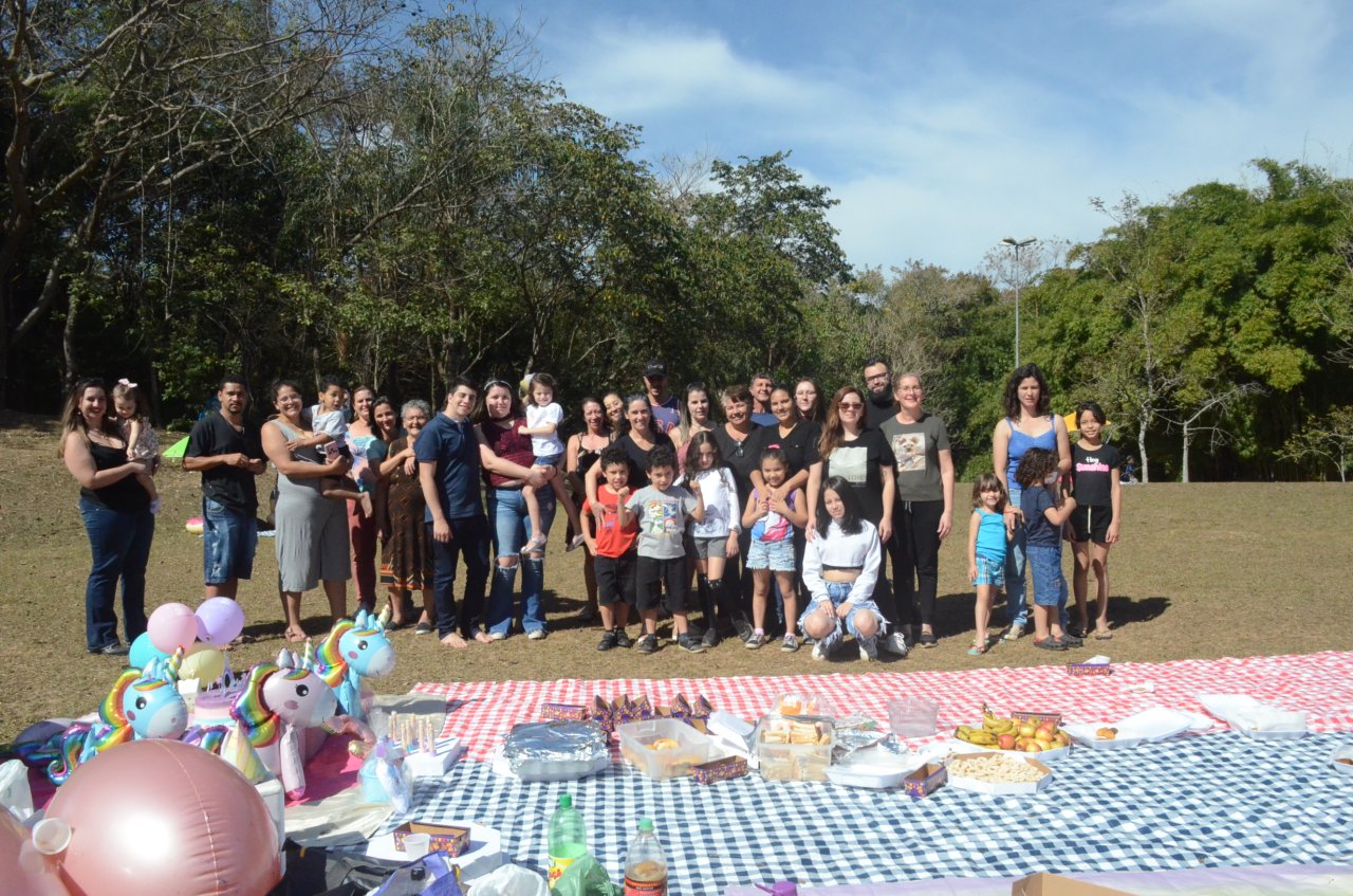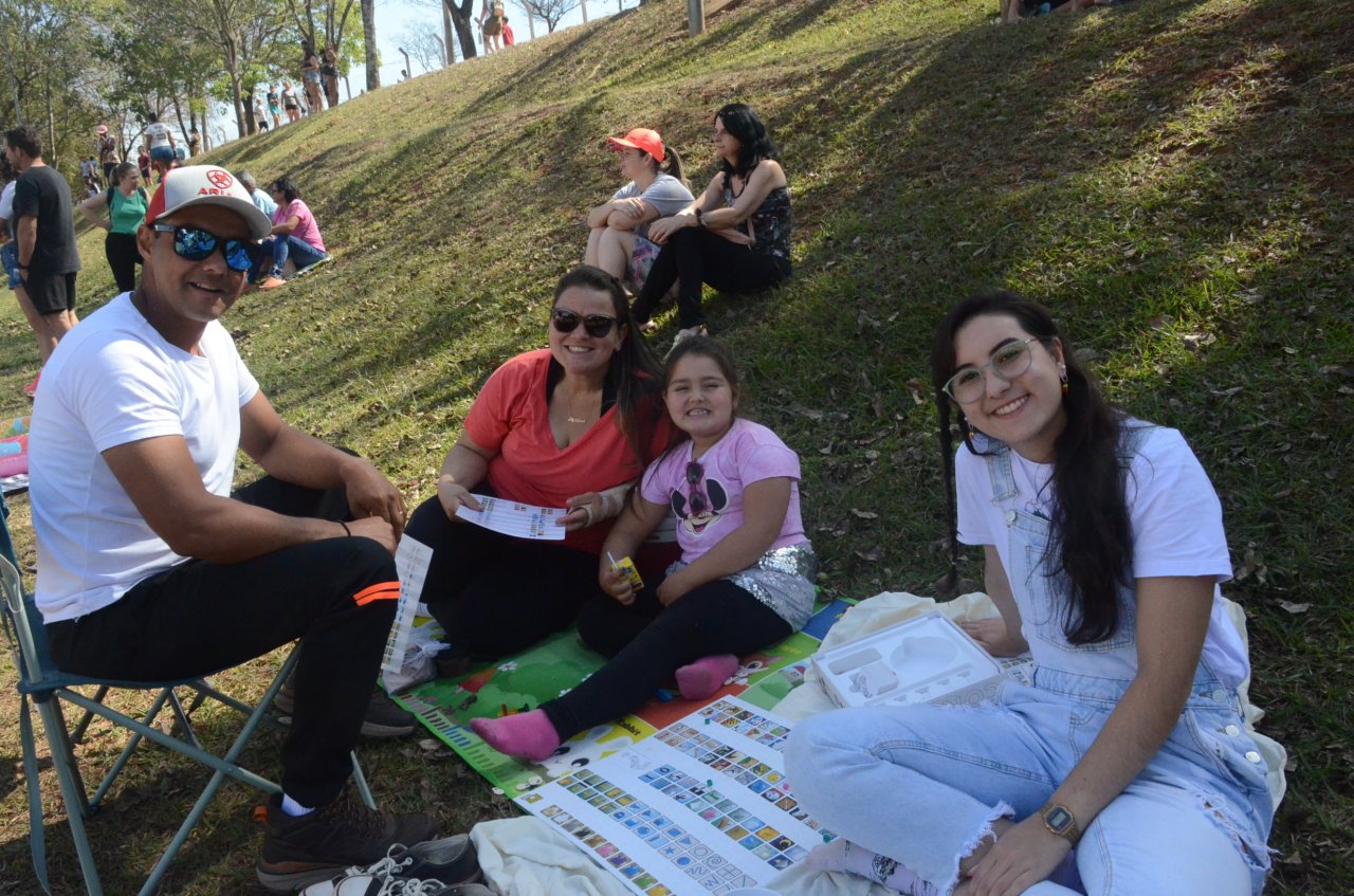 As famílias se espalharam no espaço do parque para fazer o tradicional piquenique e as crianças puderam brincar nos brinquedos infláveis.
