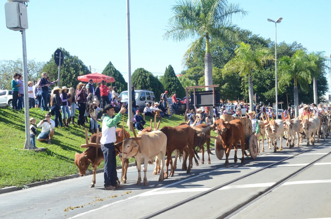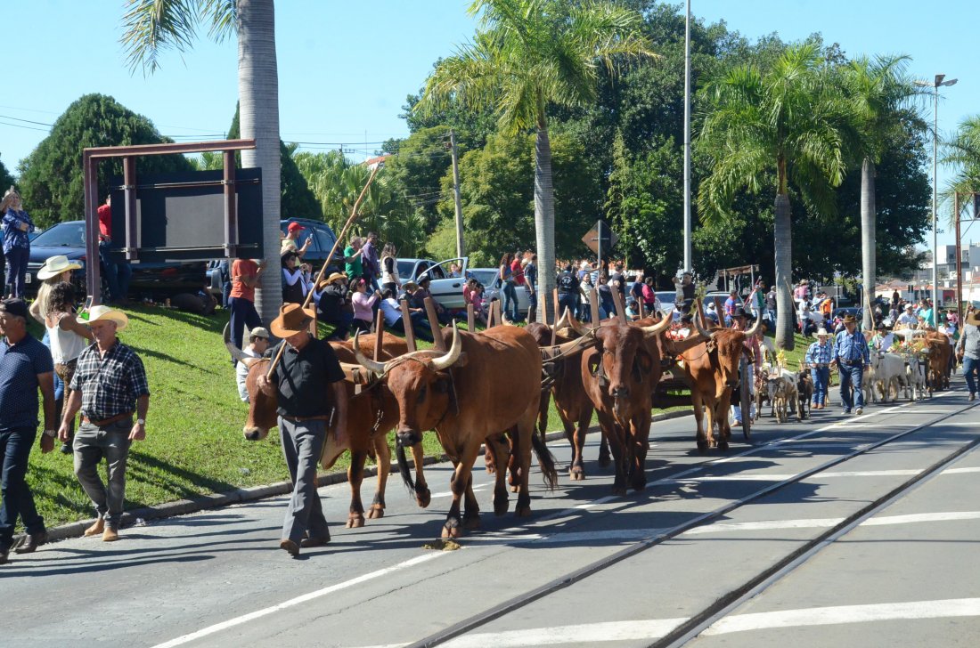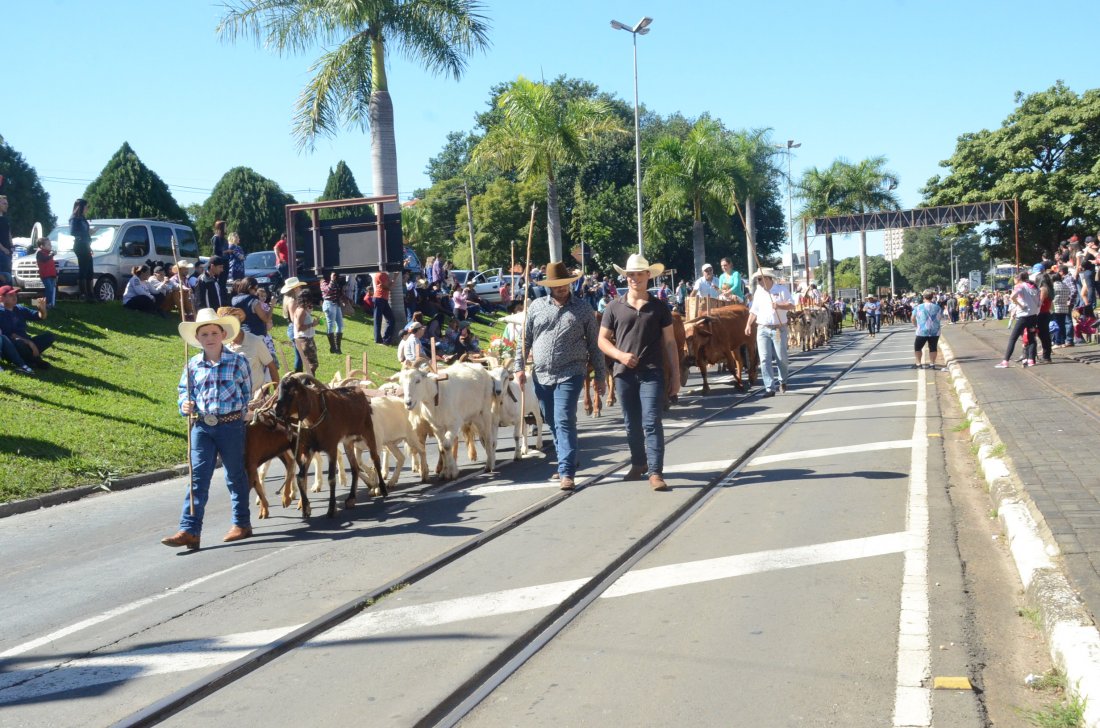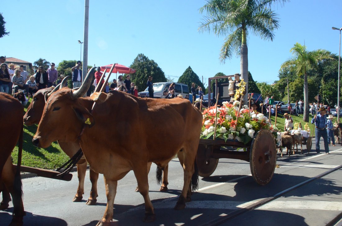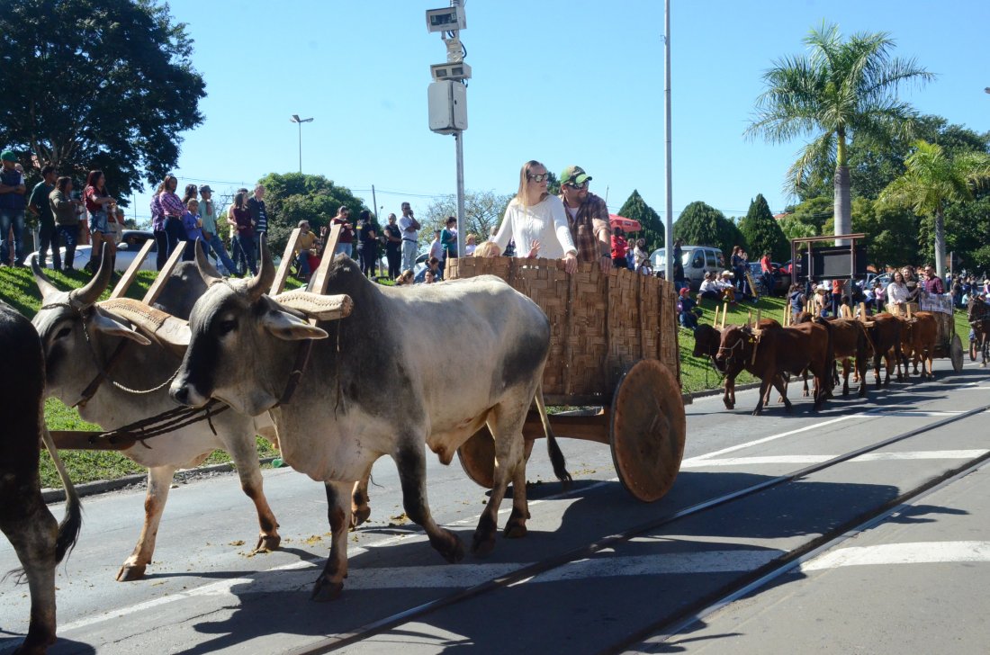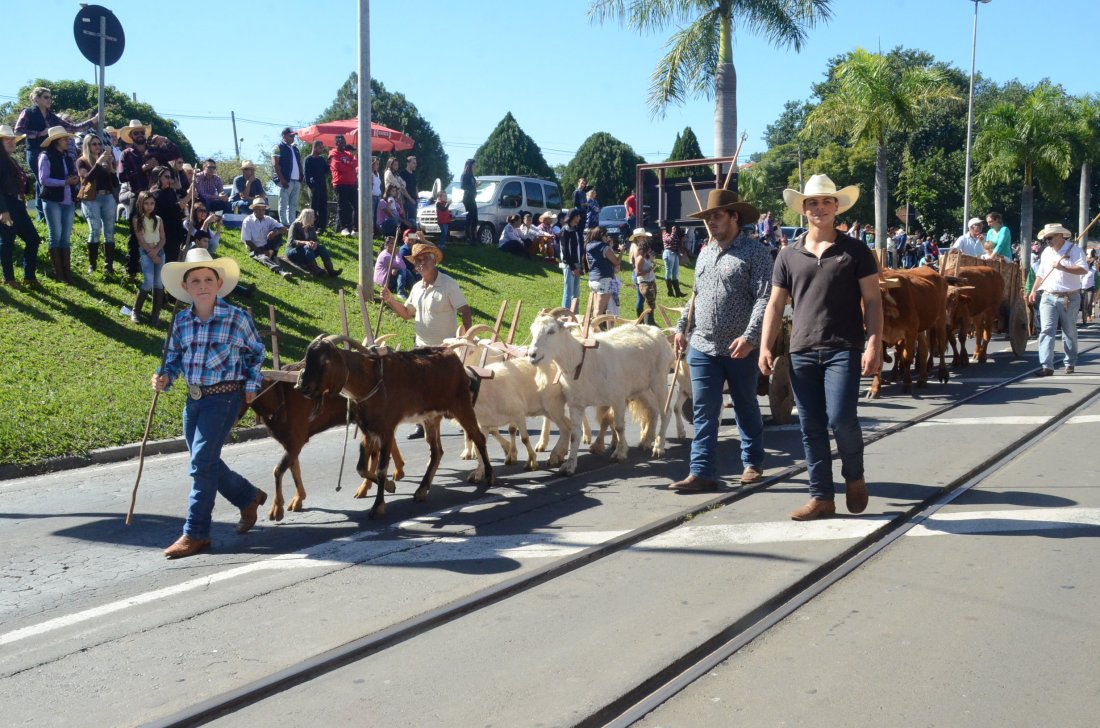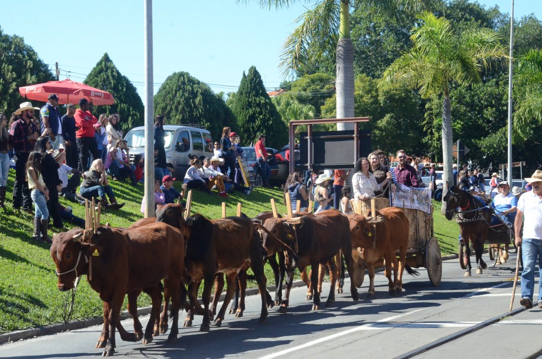 O desfile ainda manteve a tradição dos carros de boi, charretes, cavalos, bois de sela e neste ano teve a participação dos animais adestrados do cavaleiro Sérgio Faria, do Haras Agro Maripá, que vem sendo treinados há um ano.